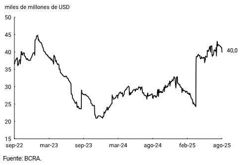 Las Reservas Internacionales del BCRA finalizaron agosto con un saldo de USD39.986 millones, lo que implicó un aumento de USD1.120 millones respecto a fines de julio (ver Gráfico 4.2). Sobre esta dinámica incidió el desembolso del Fondo Monetario Internacional por USD2.000 millones en el marco de la primera revisión del acuerdo de facilidades extendidas. Los fondos se destinaron a la recompra de Letras Intransferibles en cartera del BCRA por un Valor Efectivo de USD2.000 millones equivalente a un Valor Nominal de USD3.268,8 millones.