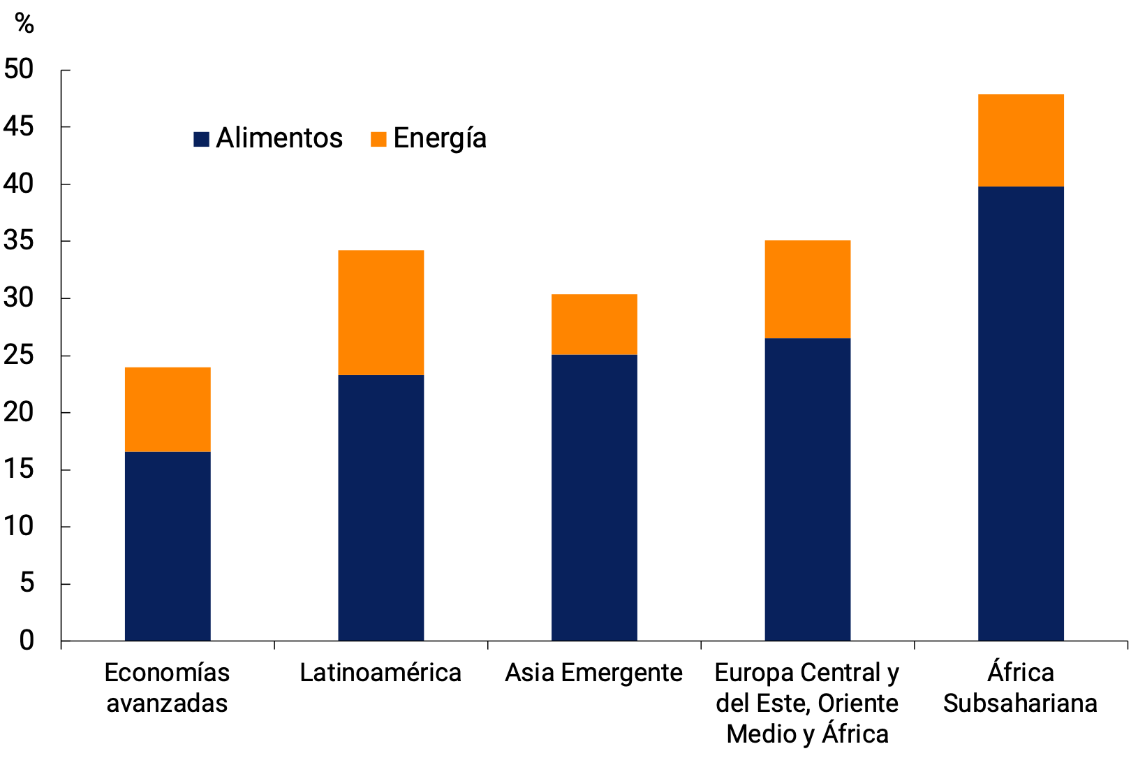 Los países en desarrollo también han venido registrando tasas de inflación varias veces por encima de sus metas antes del conflicto bélico. De hecho, en América Latina se ha ubicado en niveles superiores al resto de los países emergentes. Y el mayor peso de los alimentos en la canasta de los IPC en la región le da a esta suba un mayor sesgo regresivo (ver Gráfico 2.9).