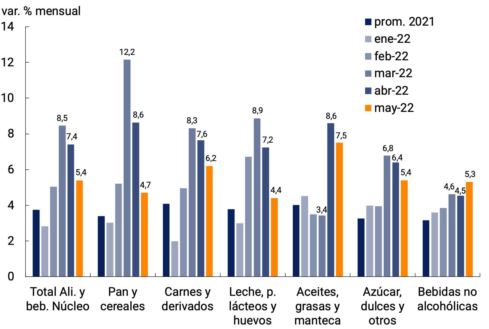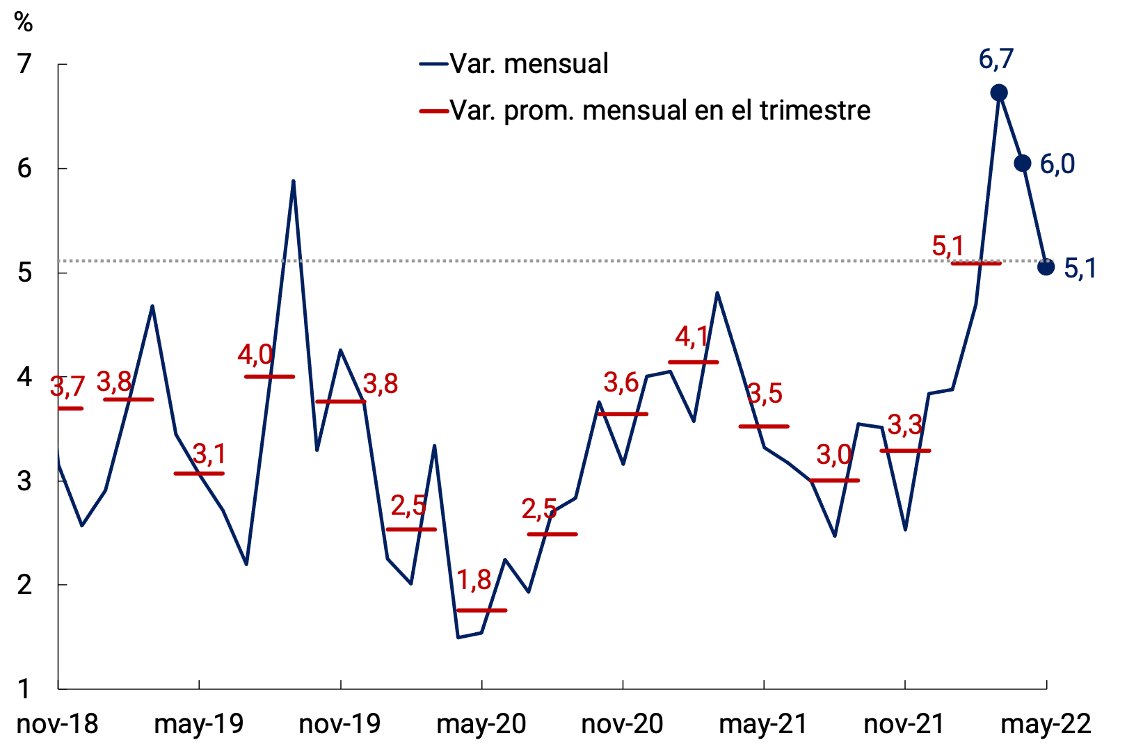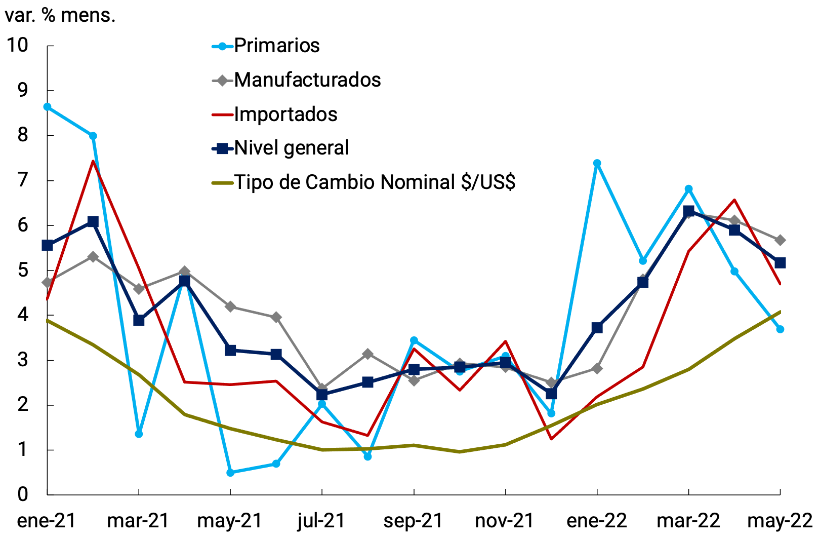 En marzo de 2022 la inflación se aceleró significativamente alcanzando una tasa de 6,7% mensual, registro muy elevado en términos históricos. Dicho aumento se observó fundamentalmente en la categoría Núcleo, y dentro de la misma, en el valor de los alimentos, traccionada por las subas de las cotizaciones internacionales de las materias primas como resultado de la guerra en Ucrania. Este shock externo afectó a la Argentina en el contexto de una actividad económica en recuperación y con una elevada inercia inflacionaria previa. Luego del máximo alcanzado en marzo para el Nivel General, los datos de mayo confirmaron la desaceleración en la inflación que se había iniciado en abril, con una significativa baja en la categoría Núcleo. No obstante, los registros inflacionarios se mantienen en niveles altos, en parte debido a la existencia de mecanismos formales e informales de indexación que contribuyen a aumentar la magnitud y persistencia del shock.