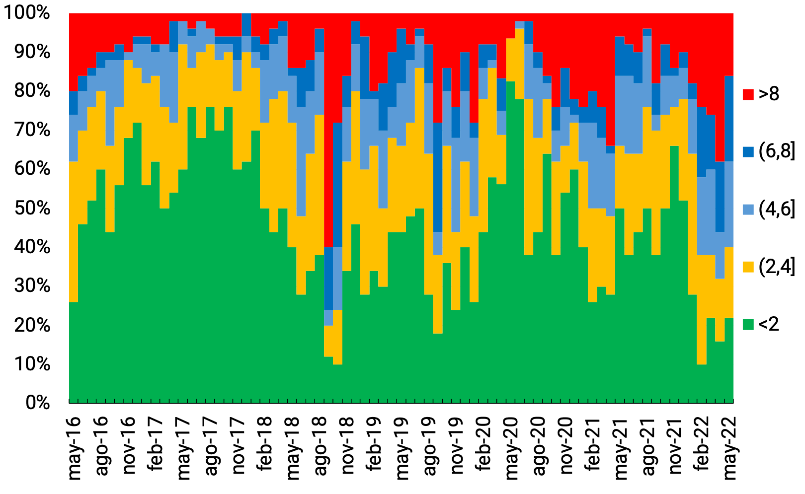 54 Esta caída acumulada en lo que va del año presenta un comportamiento heterogéneo en los meses, con una caída sistemática hasta abril y una reversión en mayo.