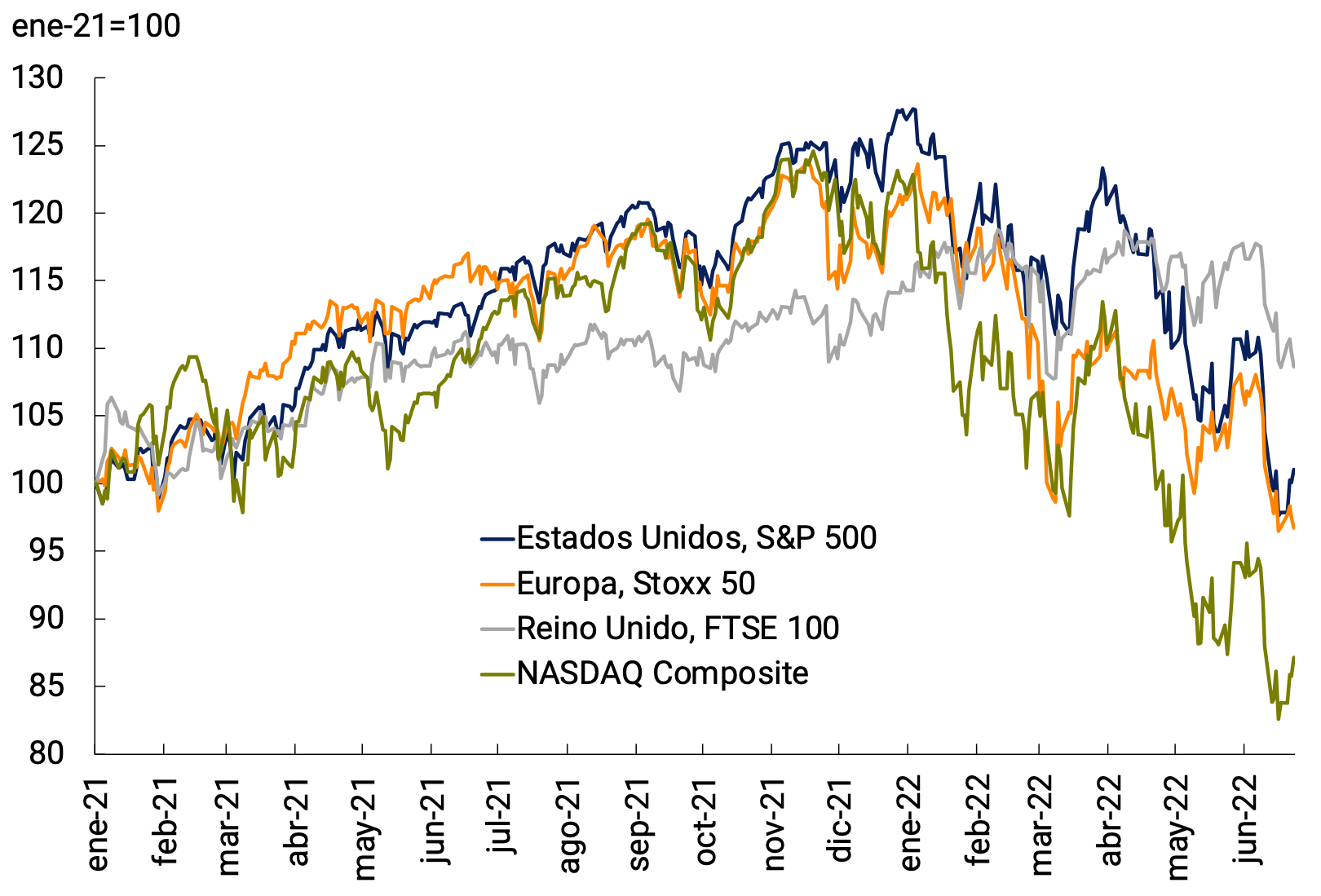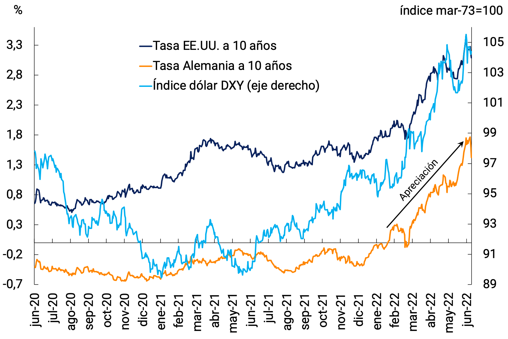 Las agresivas subas de las TPM repercutieron sobre bonos, acciones y divisas. Por un lado, subieron las tasas de los bonos del gobierno de los países avanzados. La tasa del bono del Tesoro de EE.UU. a 10 años aumentó fuertemente hasta más de 3% (ver Gráfico 2.12b), con una suba de 158 puntos básicos en el año. La tasa de bonos alemanes a 10 años también ha aumentado. En tanto, siguieron cayendo las cotizaciones de los activos más riesgosos como las acciones y, particularmente, las de las empresas tecnológicas, que habían tenido subas más importantes en los últimos años. Así, el S&P 500 está un 21% abajo del máximo y el Nasdaq, con mayor componente de empresas de tecnología, un 30% debajo. En Europa, el Stoxx 50 pierde un 20% de su valor en el año (ver Gráfico 2.12a).