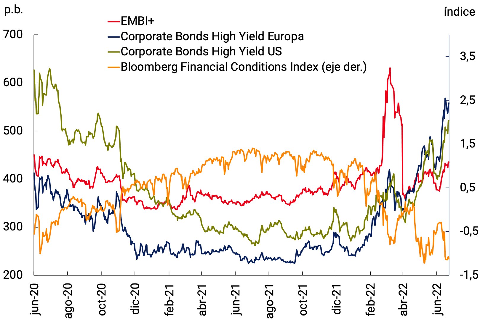 El conflicto bélico generó incertidumbre y una fuerte alza del precio de las materias primas, dando lugar a perspectivas de mayor inflación y menor crecimiento globales. La expectativa y el posterior inicio de un ciclo contractivo más agresivo por parte de la Reserva Federal de los EE.UU. (Fed) endurecieron las condiciones financieras globales. Finalmente, las restricciones en ciudades claves de China impactaron sobre el comercio internacional y las cadenas globales de suministro.
