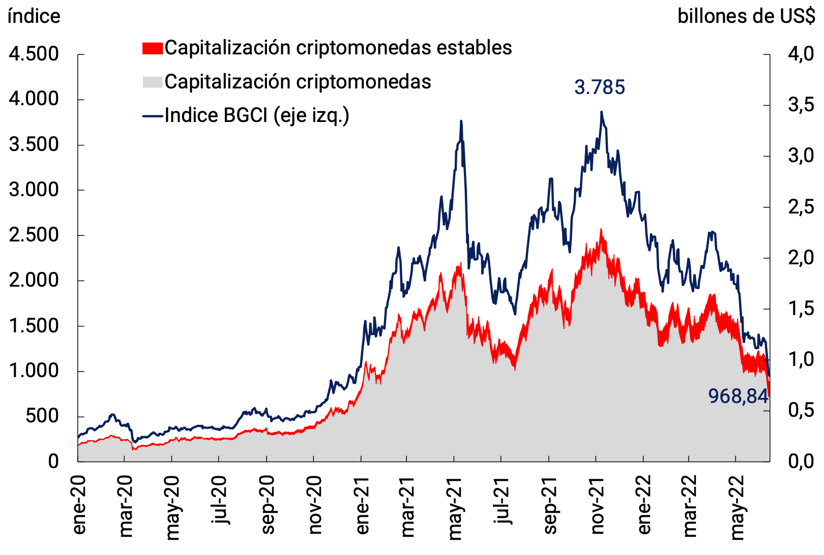 Con la caída de los activos de riesgo también sufrieron caídas las criptomonedas, mostrando que no son “activos de refugio”. La capitalización de mercado de ocho cripto monedas y cuatro “monedas estables” se redujo en 70% desde mediados de noviembre pasado; mientras que los precios de esos activos son 75% menores (ver Gráfico 2.13b)2.