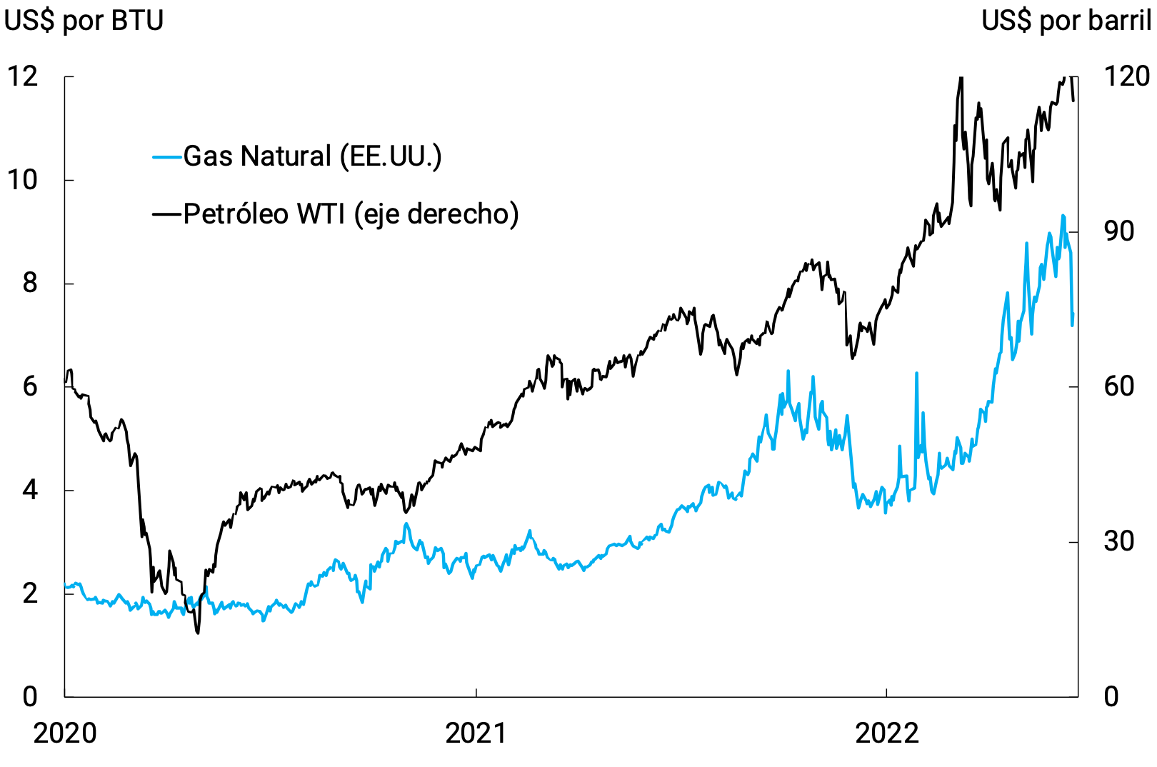 Las sanciones impuestas a Rusia continuaron impactando fuertemente tanto en el nivel como en la volatilidad del precio del petróleo, que alcanzó US$119 por barril el 8 de junio (WTI). A fines de mayo, la Unión Europea acordó prohibir la importación de petróleo ruso, comenzando a regir en diciembre sobre el crudo y dos meses más tarde sobre los productos refinados: prohíbe todo el crudo que llega por barco y deja fuera al que lo hace por oleoducto, alcanzando de esta forma casi al 90% del petróleo importado desde Rusia. El precio del gas también se vio afectado luego de que Rusia impusiera el pago del gas en rublos en lugar de euros. Varios países europeos vieron cortado su suministro durante abril y mayo al no cumplir el requisito. Creció así la importación de gas desde EE.UU., alcanzando un precio de US$9,45 por BTU, el mayor en 14 años (ver Gráfico 2.14).