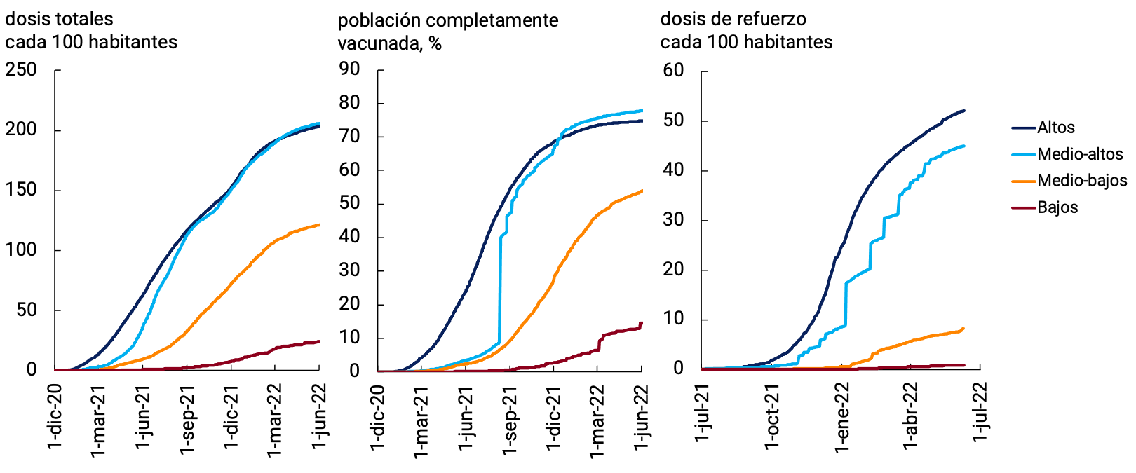 Las campañas de vacunación continúan: un 65% de la población mundial ha recibido al menos una dosis, aunque se mantiene la brecha entre países. El porcentaje de población completamente vacunada en los países de ingresos bajos es más de 8 veces menor que en los países de ingresos altos; y mientras que los países de altos ingresos tienen más de 45 dosis de refuerzo cada 100 habitantes, los de bajos ingresos han aplicado menos de 0,4 (ver Gráfico 2.2).