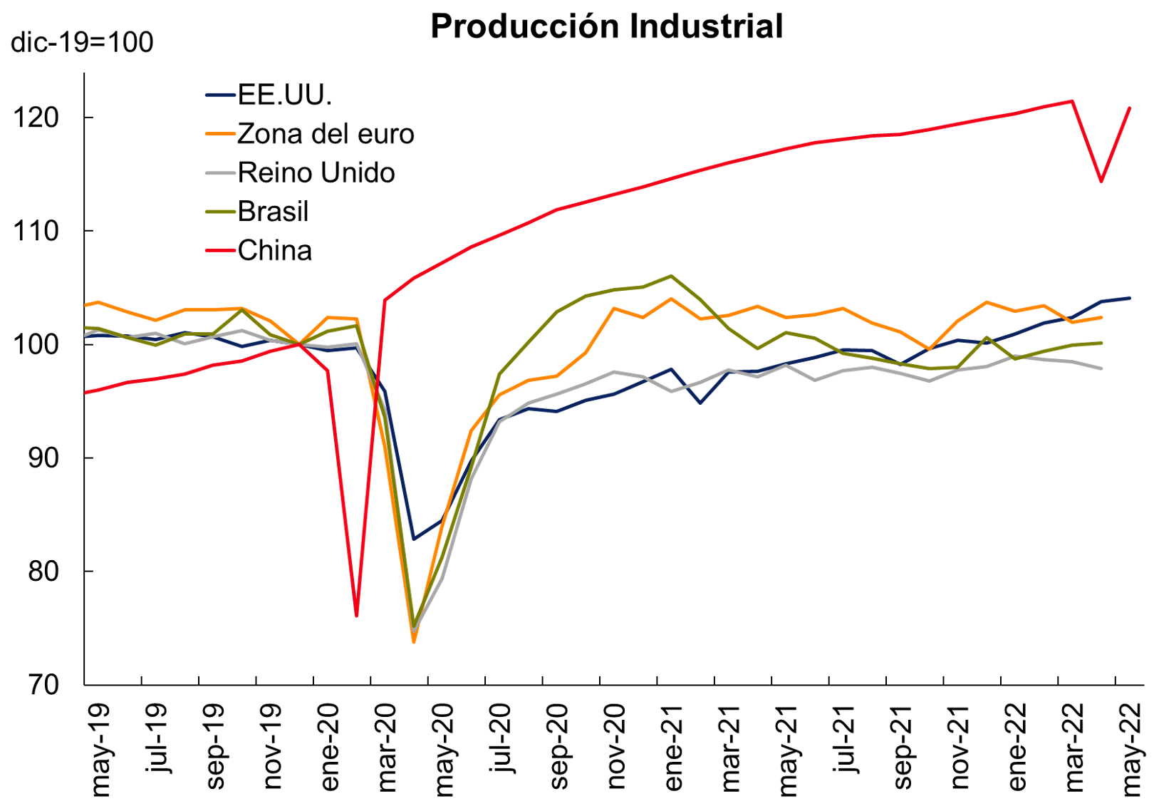 En China, las restricciones a la movilidad dieron lugar a contracciones de las ventas minoristas, la producción industrial y el PMI, sólo superadas en los últimos meses por las registradas cuando irrumpió la pandemia a principios de 2020. En mayo comenzaron a notarse los efectos de una relajación de las restricciones, con una recuperación parcial de los indicadores de actividad.