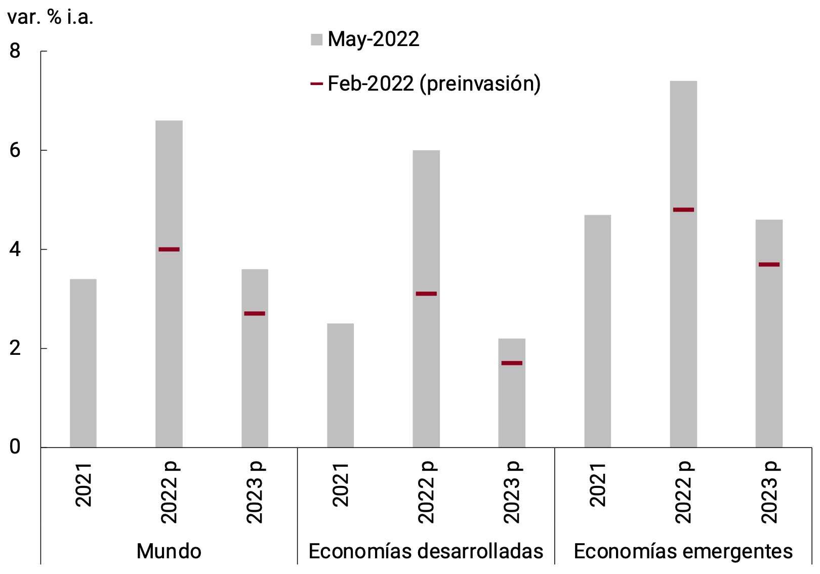 Fuente: FMI (WEO), Banco Mundial, Reuters (consenso de mercado) y otras fuentes: OCDE (mundo y China), BCE (zona del euro), Fed (Estados Unidos), BCB – Encuesta Focus (Brasil). (1) Abril de 2022. (2) Mayo de 2022.