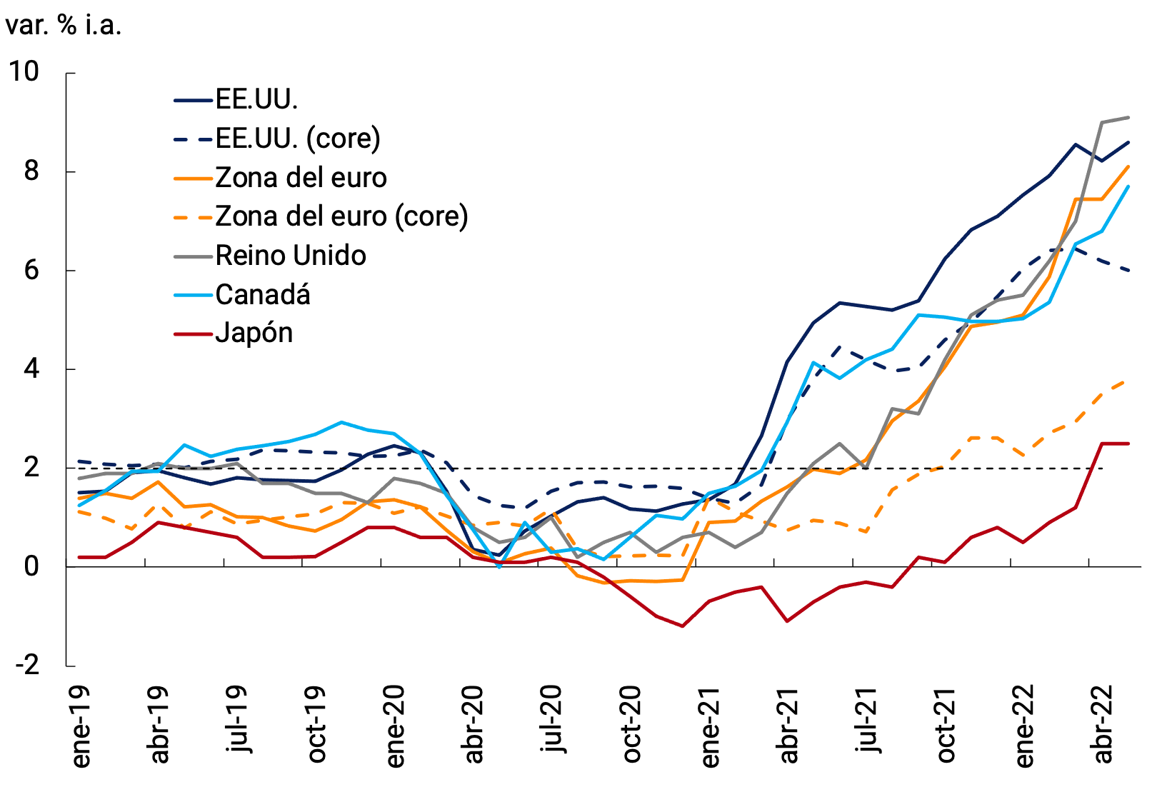En los EE.UU., la inflación asciende a 8,6% en mayo (la mayor tasa desde diciembre de 1981); en la zona del euro, a 8,1% (mayor tasa desde el surgimiento de la unión monetaria); en Canadá, a 6,8% (la mayor inflación desde 1990) y 9,1% en Inglaterra (máximo histórico de la actual medición). Incluso Japón —con décadas de baja inflación— pasó de una deflación de 1,1% doce meses atrás a una inflación de 2,5% en mayo (la mayor desde 2015). Esta dinámica se está generalizando más allá de los rubros de alimentos y energía en los EE.UU. y la zona del euro (ver Gráfico 2.6).