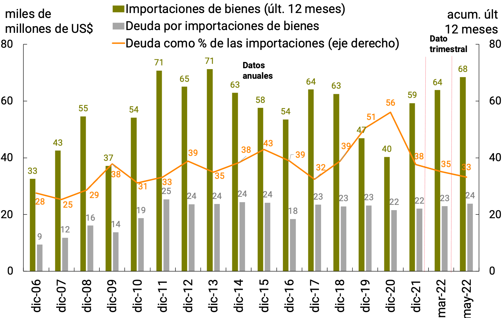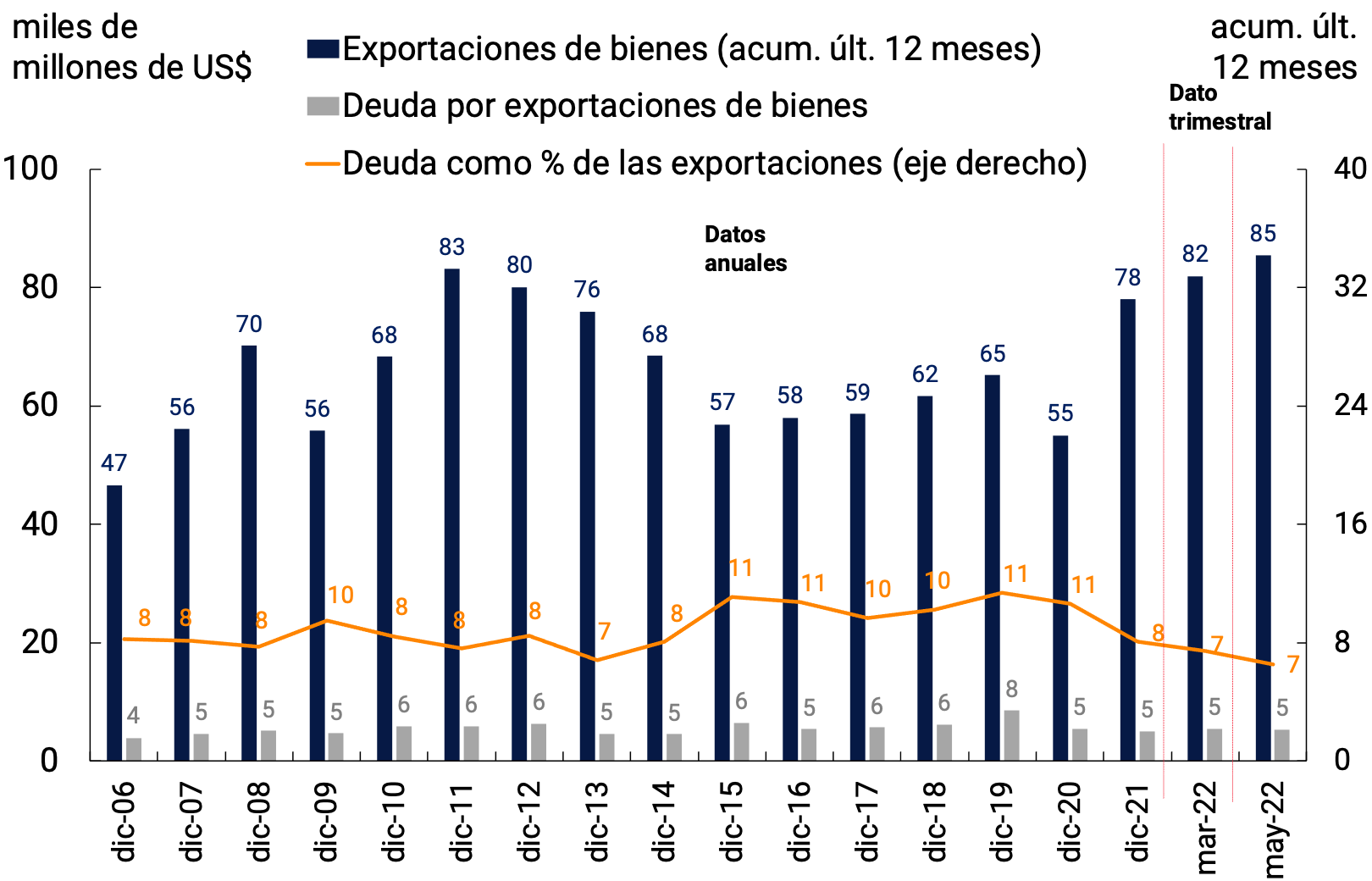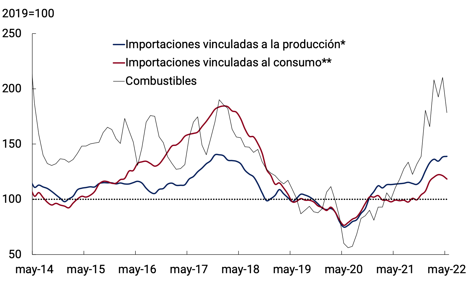 El contexto externo se ha vuelto más complejo en los últimos tres meses. La profundización del conflicto bélico en Ucrania empujó al alza los precios internacionales de los alimentos y la energía y socavó el dinamismo de la actividad económica global. Las mayores presiones inflacionarias llevaron a un ciclo de contracción monetaria en las economías avanzadas más acentuado que el esperado a inicios de año. El aumento en las tasas de interés globales presionó los valores de los activos financieros que cotizan en las principales plazas bursátiles del mundo, generó una apreciación global del dólar y elevó el riesgo de salida de capitales desde los países emergentes. Para los países en desarrollo, y en particular los de Latinoamérica, se abrieron diferentes perspectivas en materia de crecimiento e inflación dependiendo de si se mantienen las presiones al alza de los precios de las materias primas y la consecuente apreciación real de los tipos de cambio; o bien, si la apreciación del dólar redunda en menores precios de las materias primas y tipos de cambio reales más depreciados.