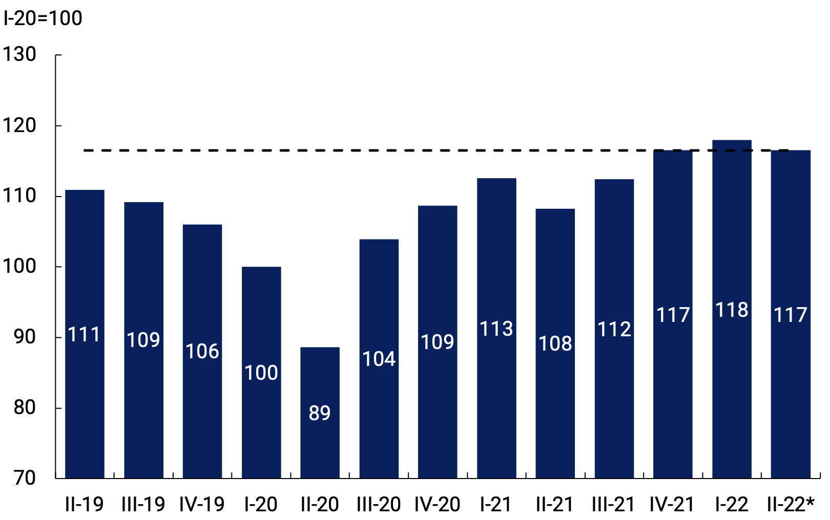 Con datos al primer trimestre, la actividad económica cuenta con un arrastre estadístico de 4,1 puntos porcentuales de crecimiento para este año. El BCRA espera que los servicios que se vieron más afectados por la pandemia continúen recomponiendo sus niveles de actividad. No obstante, en el segundo trimestre el Producto mostrará una caída respecto del primero debido al impacto de las condiciones de sequía que afectaron a las principales zonas productoras de soja y maíz durante el verano, con efectos indirectos sobre otros sectores asociados a esta actividad. La evolución del PIB durante el resto del año continuará condicionada por los riesgos asociados a un escenario internacional menos favorable y las tensiones en el mercado energético, al tiempo que aún no pueden descartarse nuevas amenazas epidemiológicas a nivel global.