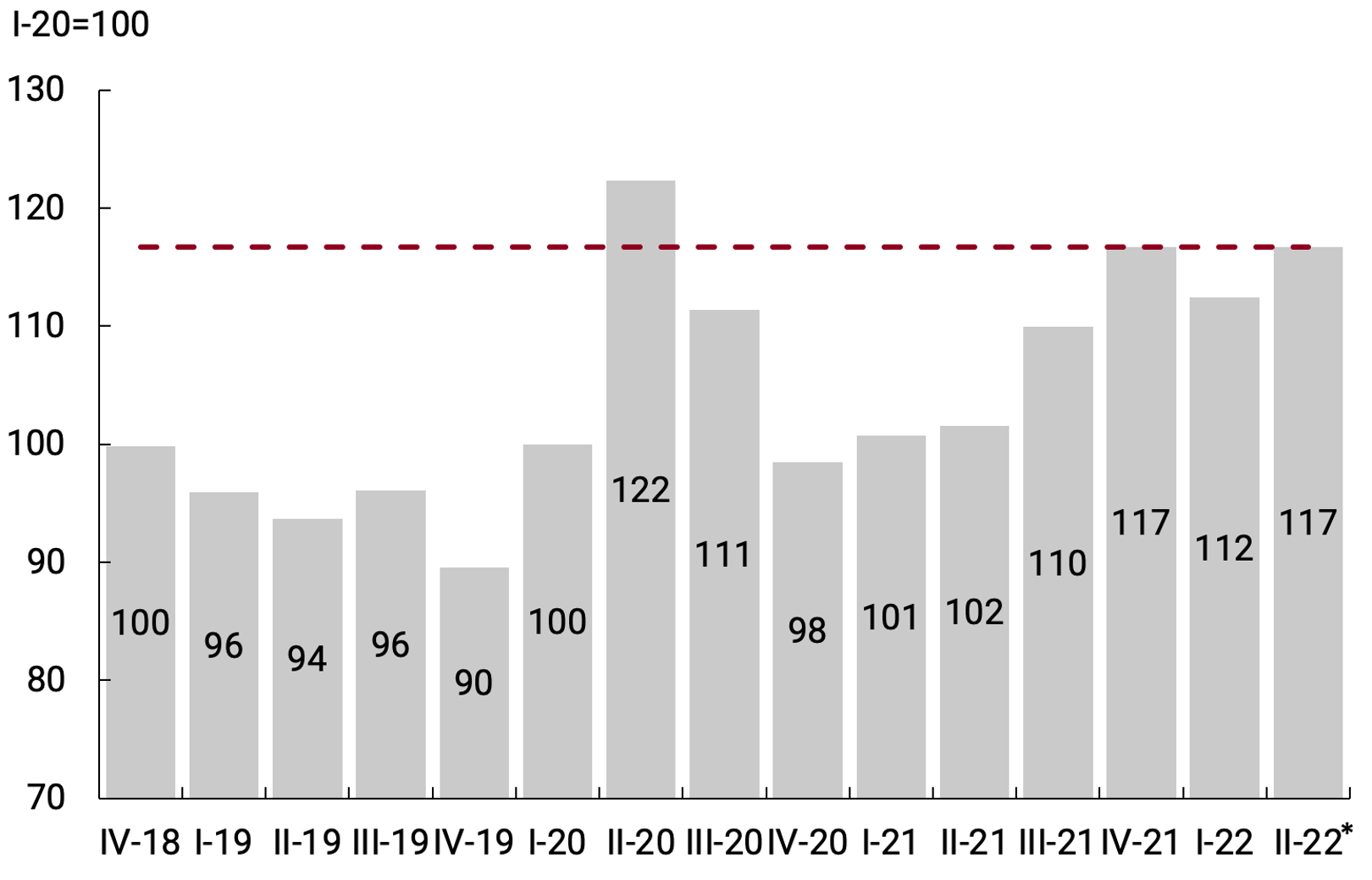 La Tasa de inversión (medida a precios constantes y desestacionalizada) se ubicó en 20,9%, el nivel más alto desde el II-18 y por encima del 17,2% promedio de 2019. La recuperación de la inversión tras el shock provocado por el Covid-19 se explicó fundamentalmente por el aumento del gasto real en Equipamiento durable de producción, que acumuló una suba de 60,5% desde el IV-19 en términos desestacionalizados, representando el 59% de la inversión total en el I-22. La inversión en construcción, por su parte, acumuló un incremento de 16,8% s.e. en el mismo período (ver Gráfico 3.2).