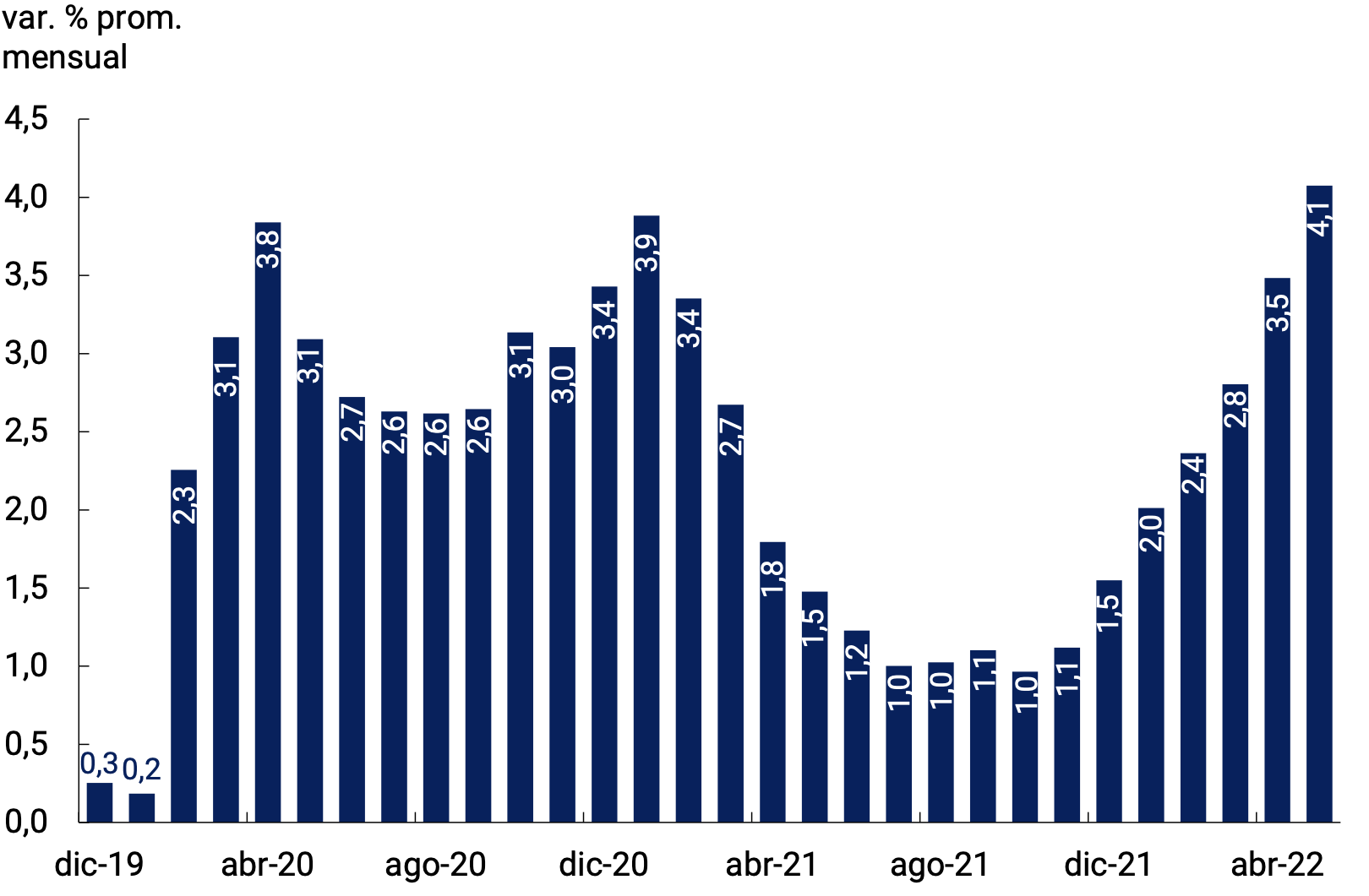 En el primer trimestre del año 2022 la actividad económica continuó afianzando el proceso de reactivación y crecimiento económico iniciado en 2021, tras la progresiva normalización de la movilidad social, y se mantuvo operando en niveles superiores a los de prepandemia. Este crecimiento tuvo lugar aún en el marco de una tercera ola de COVID-19 en el país, con impactos acotados y transitorios sobre el nivel de actividad dados los avances del proceso de vacunación y en un contexto de aceleración de la inflación afectada por las condiciones climáticas adversas en el país y por fuertes subas de los precios internacionales. Esta mejora de la actividad económica fue acompañada por una recuperación del empleo registrado total que, si bien continuó presentando cierta heterogeneidad sectorial, su nivel se encuentra en un máximo histórico.