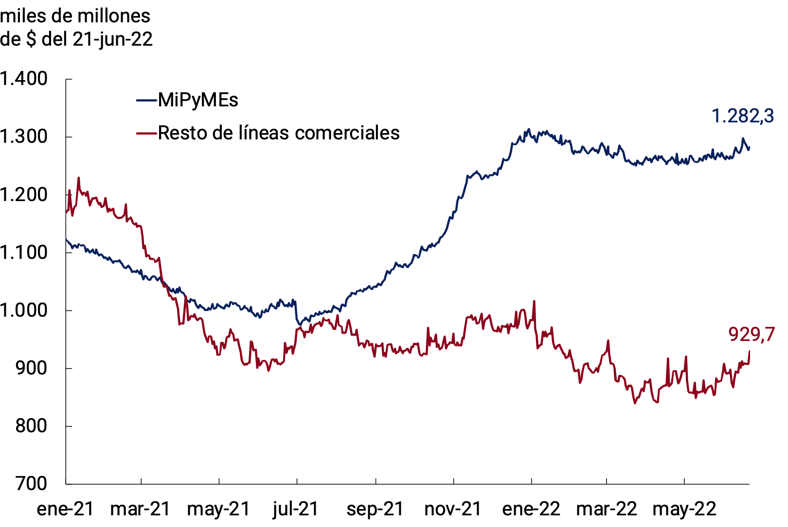 La economía argentina continuó consolidando su proceso de recuperación iniciado en 2021 y se mantuvo operando en niveles superiores a los de prepandemia, con aumentos en la tasa de inversión. Esta mejora de la actividad económica fue acompañada por una recuperación del empleo registrado, que se encuentra en un máximo histórico. Luego de un primer trimestre de crecimiento, se espera que el PIB se contraiga levemente durante el segundo trimestre debido al impacto de las condiciones de la sequía que afectó a las principales zonas productoras de soja y maíz durante el verano y que, luego, retome su senda de crecimiento en el segundo semestre del año, para cerrar 2022 con una expansión en torno al 4%. En este contexto de continuidad en el proceso de recuperación de la actividad económica el BCRA focalizó su política de crédito en los sectores más rezagados y en el financiamiento del desarrollo productivo y el cambio estructural. La Línea de Financiamiento a la Inversión Productiva (LFIP) continuó siendo la principal herramienta utilizada para canalizar el crédito productivo a las MiPyMEs bajo condiciones favorables. El saldo promedio de las financiaciones otorgadas entre el 1 de octubre de 2021 y el 31 de marzo de 2022 mediante la LFIP alcanzó a $670.000 millones.