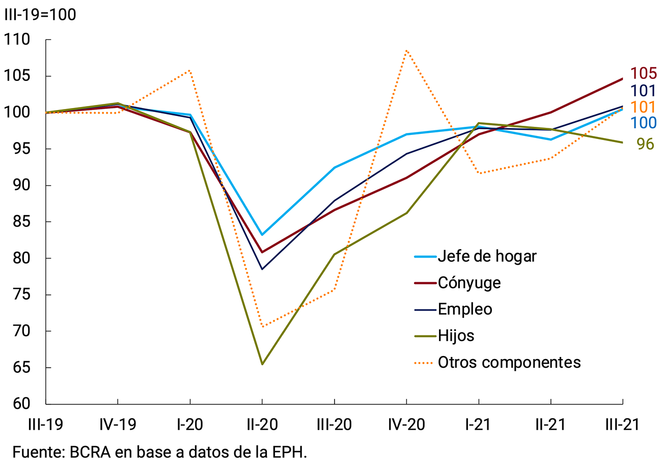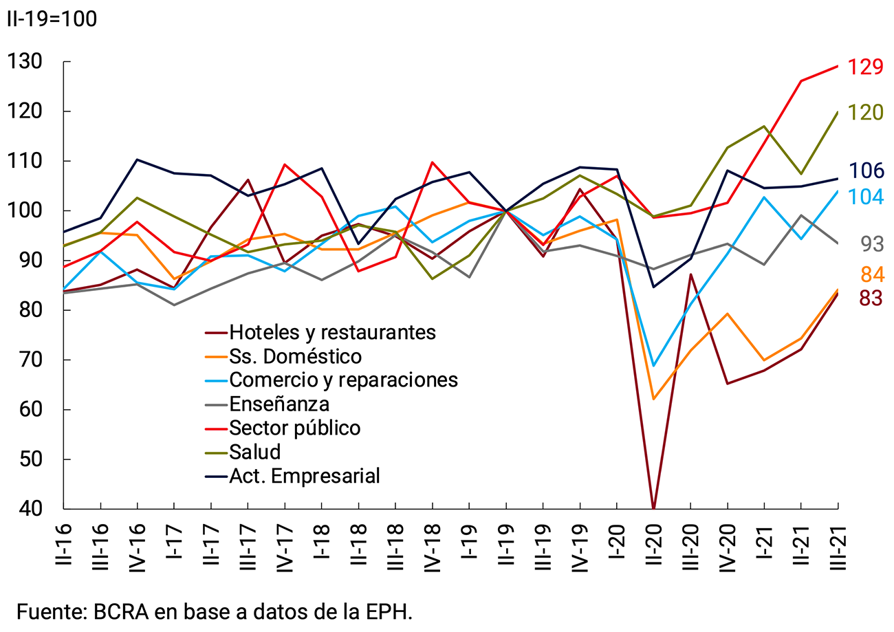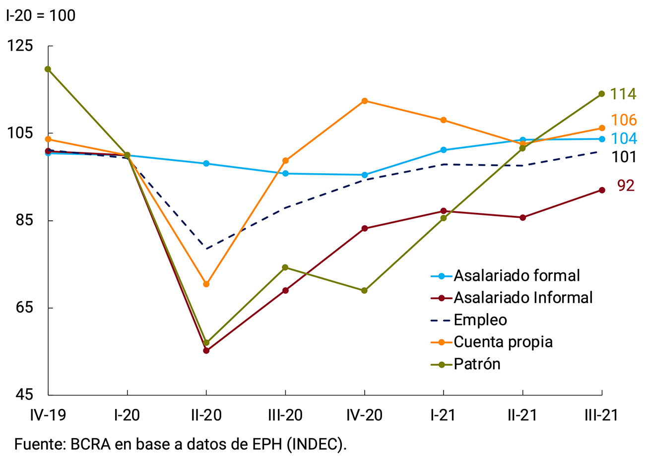 Cabe destacar que uno de los rasgos característicos de la crisis por COVID-19 en Argentina fue la recuperación asimétrica de la actividad con relación a los puestos de trabajo de calidad (formales y de tiempo completo), observándose una mayor precarización laboral en relación con la prepandemia (ver punto 3.1.3 sobre el Mercado laboral). Esta recuperación lenta del empleo asalariado privado registrado afectó fundamentalmente al conjunto de la población de los estratos de menores ingresos —con empleos menos calificados—, cuya propensión a consumir es relativamente más alta que la media. Los sectores que son mano de obra intensivos, como los servicios, fueron severamente afectados en 2020 y no pudieron recuperarse totalmente en 2021, existiendo todavía una elevada incertidumbre en cuanto al fin de la pandemia que ralentiza las decisiones de contratación de personal.