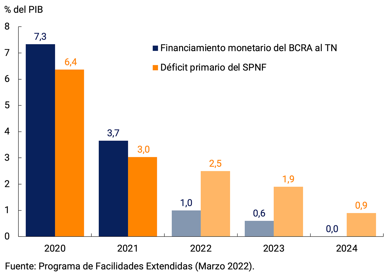 En el marco de este acuerdo, los repagos se realizarán a partir de la mitad del cuarto año posterior a la firma y se extenderán hasta el décimo año del último desembolso, es decir entre 2026 y 2034. El esquema de políticas macroeconómicas acordado estipula una reducción gradual en el déficit primario del Gobierno Federal, sin contraer el gasto público en términos reales con el objetivo de no afectar negativamente el proceso de recuperación del PIB en marcha. Asimismo, se irá reduciendo la asistencia monetaria al Tesoro en términos del PIB desde 1% en 2022 hasta alcanzar un valor nulo para 2024. En lo que refiere al resto de las políticas que implementa el BCRA las pautas incorporadas en el acuerdo están en línea con los Objetivos y Planes que se presentaron para el año. Principalmente, se buscará mantener la tasa de interés de referencia en un nivel que permita resguardar el valor real del ahorro de las y los argentinos y contribuir a la profundidad del mercado doméstico de deuda pública. En el frente externo se convino mantener el ritmo de depreciación de la moneda doméstica en un nivel que permita avanzar en el proceso de acumulación de Reservas Internacionales.