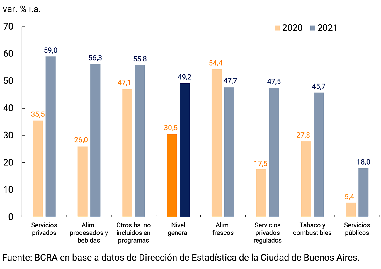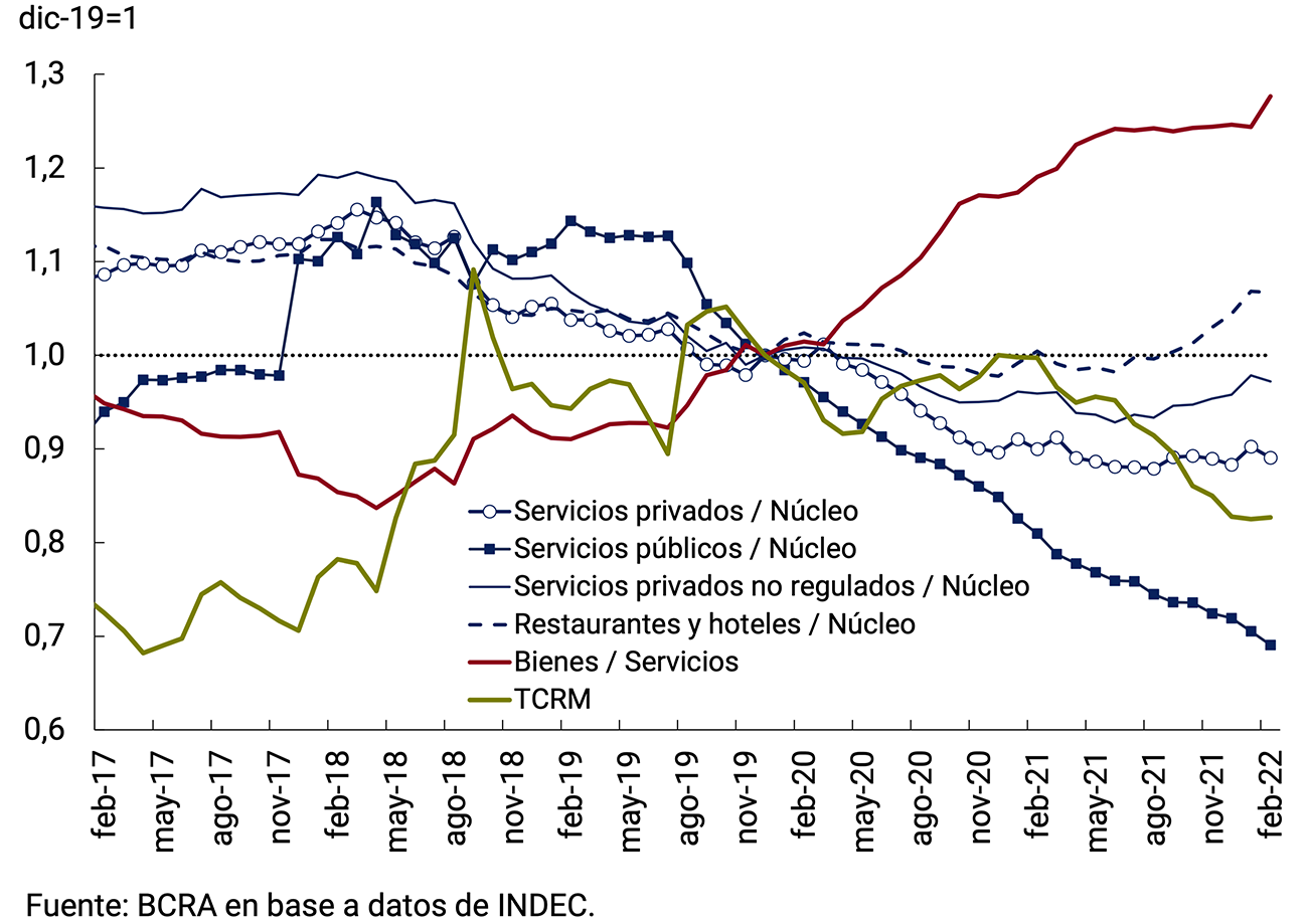 En 2021 la recuperación en la demanda de los servicios que habían sido los más afectados en 2020 contribuyó a que se interrumpiera el deterioro en el precio relativo de los servicios totales, particularmente impulsados por los incrementos de precios de la división Restaurantes y Hoteles. Por su parte, las tarifas de los servicios públicos mantuvieron subas nominales muy acotadas en 2020 y 2021 y profundizaron su deterioro frente a los demás precios del IPC. Esa evolución se dio en el marco de una política de contención tarifaria adoptada por el Gobierno Nacional para fortalecer los ingresos reales de las familias, afectados por la crisis generada por la pandemia. En resumen, los precios relativos de los servicios totales han profundizado su deterioro en los últimos dos años y, si bien se estabilizaron en el segundo semestre de 2021, se encuentran muy por debajo de los niveles prepandemia.