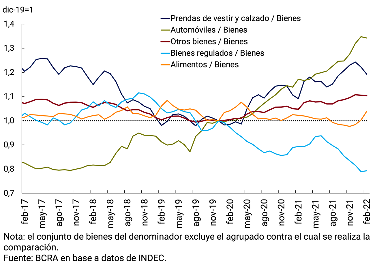 En resumen, el inicio de la pandemia de COVID-19 tuvo un impacto significativo sobre varios sectores de la economía, generando restricciones de oferta de insumos, afectando la presencialidad en los puestos de trabajo y presionando sobre las cotizaciones internacionales de las materias primas. Para mitigar estos efectos y preservar los ingresos reales de las familias, el Gobierno Nacional impulsó programas de precios de referencia para bienes básicos de consumo y mantuvo prácticamente estables las tarifas de los servicios públicos en términos nominales. De esta forma, se acentuó el deterioro de precios relativos de los servicios en relación con los bienes, tendencia que se estabilizó durante el segundo semestre 2021 debido a la recuperación en los servicios privados, que habían sido más afectados durante el período de mayores restricciones a la circulación. Por otra parte, la evolución de los precios domésticos de los alimentos fue diferenciada, con una marcada recuperación de los precios relativos de los frescos y una caída de los procesados. En los últimos dos años también se observaron incrementos muy significativos en los precios relativos promedio de ciertos bienes que no fueron alcanzados por programas y sobre los cuales existieron restricciones de oferta en especial, en automóviles e indumentaria. En el mediano plazo, sería esperable que las actualizaciones en las tarifas de los servicios públicos y la recomposición de los márgenes de los sectores prestadores de servicios privados conduzcan a que las divergencias observadas durante los últimos años se atenúen y a que los servicios recuperen parte del peso relativo perdido. Por su parte, la suba de los precios de las materias primas, impulsada por el reciente conflicto entre Rusia y Ucrania, podría ejercer presión adicional sobre los precios de algunos bienes, ralentizando la recomposición de los precios relativos de los servicios. Además, este contexto también podría afectar la normalización de la oferta de bienes puntuales (como automóviles), demorando la reversión de las extraordinarias subas experimentadas en los últimos años. La evolución del resto de los precios relativos de la economía dependerá de un conjunto de variables domésticas e internacionales que resultan determinantes, entre los que se destacan el tipo de cambio real, la demanda interna y externa de cada producto, los precios internacionales, los cuellos de botella de oferta local y/o global, y los factores climáticos, entre otros.