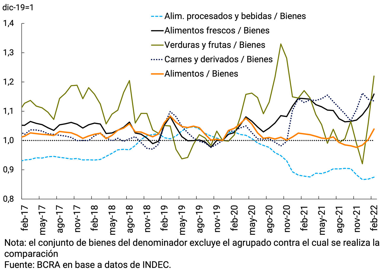 El significativo fortalecimiento relativo de los precios de los Alimentos frescos que alcanzó su máximo en el primer trimestre de 2021 fue impulsado inicialmente por fuertes incrementos en los precios de las frutas y verduras, afectados por dificultades en su transporte y producción, en un contexto de restricciones a la movilidad. Luego de un año con subas muy acotadas, las Carnes y derivados evidenciaron hacia fines de 2020 importantes incrementos que volvieron a impulsar el precio relativo de los Alimentos frescos, en el contexto de un proceso de alza de los precios internacionales de las materias primas. Desde el segundo trimestre de 2021 el peso de los Alimentos frescos inició una tendencia a la baja que se acentuó desde junio tras las regulaciones a las exportaciones de carne vacuna por parte del Gobierno Nacional45. En noviembre y diciembre de 2021, como resultado del significativo incremento en la carne vacuna, el precio relativo de los alimentos frescos volvió a recuperarse y finalizó el año en niveles muy superiores a los de prepandemia (ver Gráfico 3).