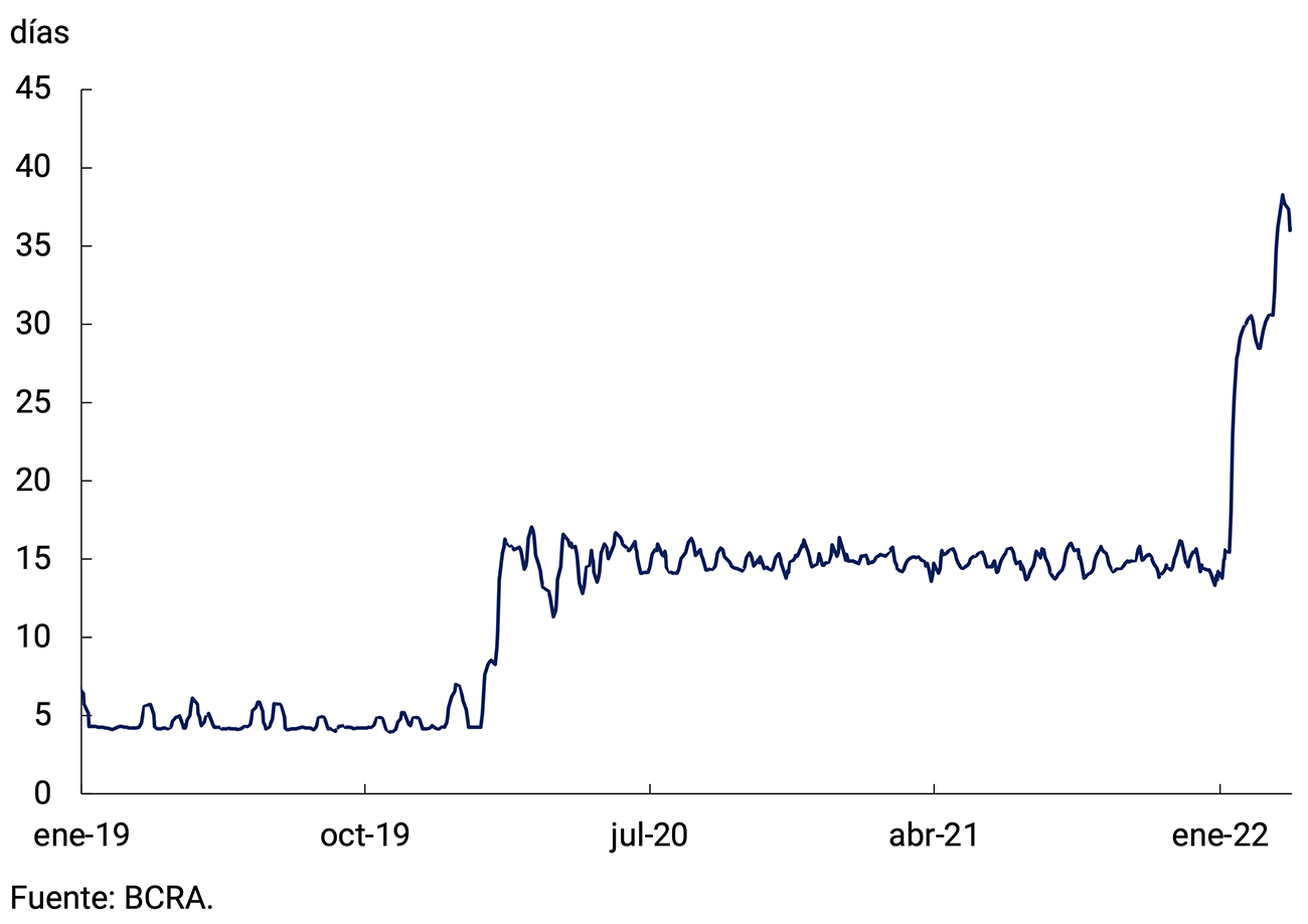 Los cambios introducidos en los instrumentos de regulación monetaria del BCRA buscaron alcanzar dos objetivos simultáneos: volver a focalizar la señal de tasa de interés de política en la tasa de LELIQ a 28 días de plazo y crear un instrumento de mayor plazo (LELIQ a 180 días/NOTALIQ a 183 días). La creación de estos nuevos instrumentos continúa una política iniciada al principio de la gestión con el cambio de plazo de las LELIQ más cortas de 7 a 28 días en febrero de 2020. De esta manera, el plazo residual promedio del stock total de LELIQ prácticamente que se duplicó, al pasar de 15 a 35 días aproximadamente (ver Gráfico 7.1).