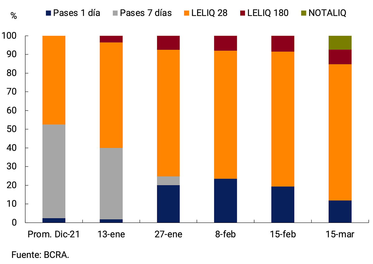 Los cambios en la estructura y el funcionamiento de los instrumentos de regulación monetaria dieron lugar a un cambio en la composición de estos. En primer lugar, se observó un desarme completo de los pases a 7 días a lo largo de enero. Cabe señalar que en diciembre estos representaban prácticamente el 50% del total de los pasivos remunerados. La liquidez que estaba colocada en pases pasivos a 7 días se distribuyó de la siguiente manera a mediados de marzo: 25 p.p. se colocaron en LELIQ a 28 días y 8 p.p. en la especie a 180 días, 9 p.p. se concertaron a pases a 1 día y los 7 p.p. restantes se canalizaron a NOTALIQ.