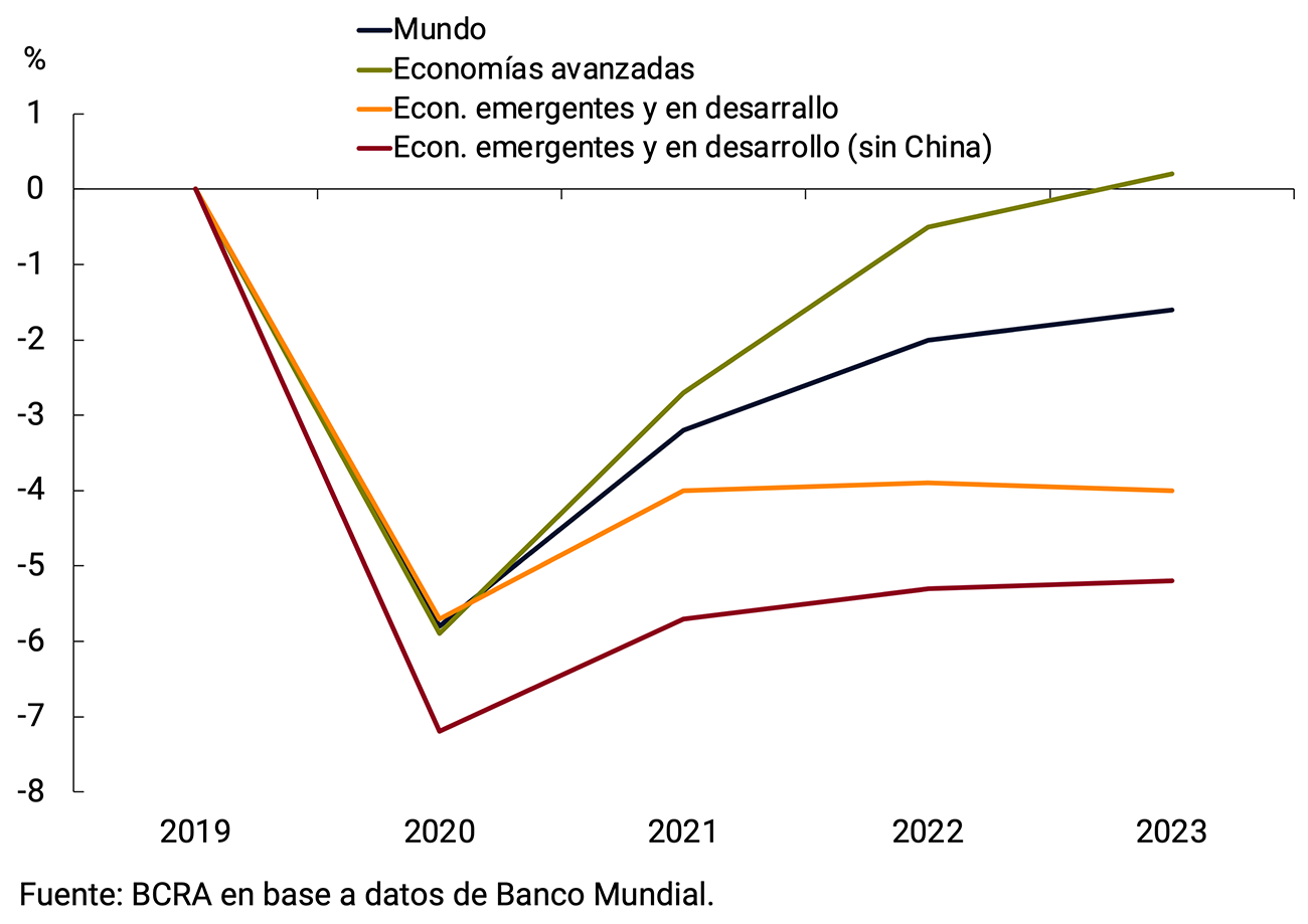 La recuperación seguiría siendo divergente entre países avanzados y en desarrollo ante las diferencias en el acceso a las vacunas y en el espacio de política y el impacto del ciclo monetario en ambos grupos de países. Según el Banco Mundial, y considerando los pronósticos previos al conflicto, la actividad económica en las economías avanzadas superaría la trayectoria pronosticada antes de la pandemia en 2023; mientras que la de las economías emergentes y en desarrollo se mantendría 4 p.p. por debajo de la tendencia previa a la pandemia, diferencia que se amplía a 5,2 p.p. si se excluye a China de este último grupo (ver Gráfico 2.10).