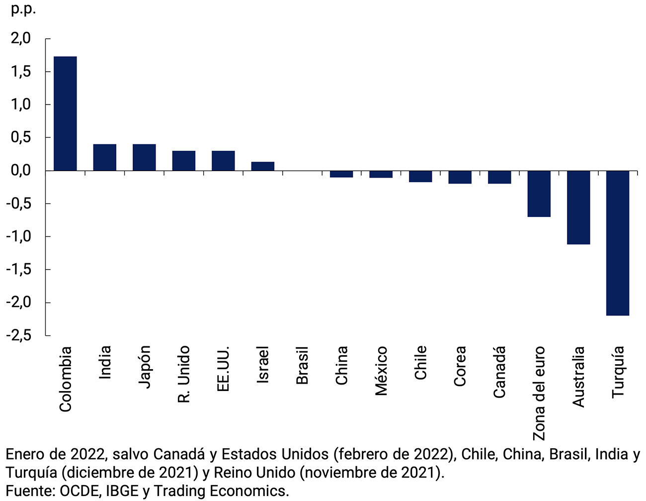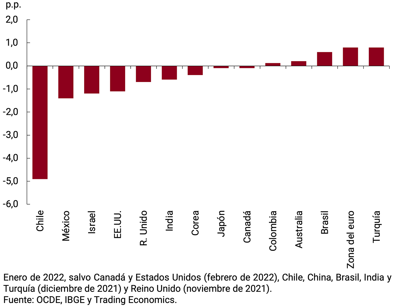 La economía global continuó recuperándose, pero moderando su ritmo de expansión por el impacto de la nueva ola pandémica. Su crecimiento estimado para este año se ha reducido desde el IPOM anterior, lo que considera también el efecto de una política monetaria más contractiva, el retiro progresivo de la expansión fiscal y la persistencia de problemas en las cadenas globales de suministros. Esto último, junto con los mayores precios de la energía y otras materias primas, ha estado detrás de buena parte de la suba global de la inflación, mayor a la esperada. Los bancos centrales de economías avanzadas han comenzado a revertir el sesgo expansivo de su política; mientras que los de países en desarrollo, que habían reaccionado antes, continuaron subiendo las tasas de interés.