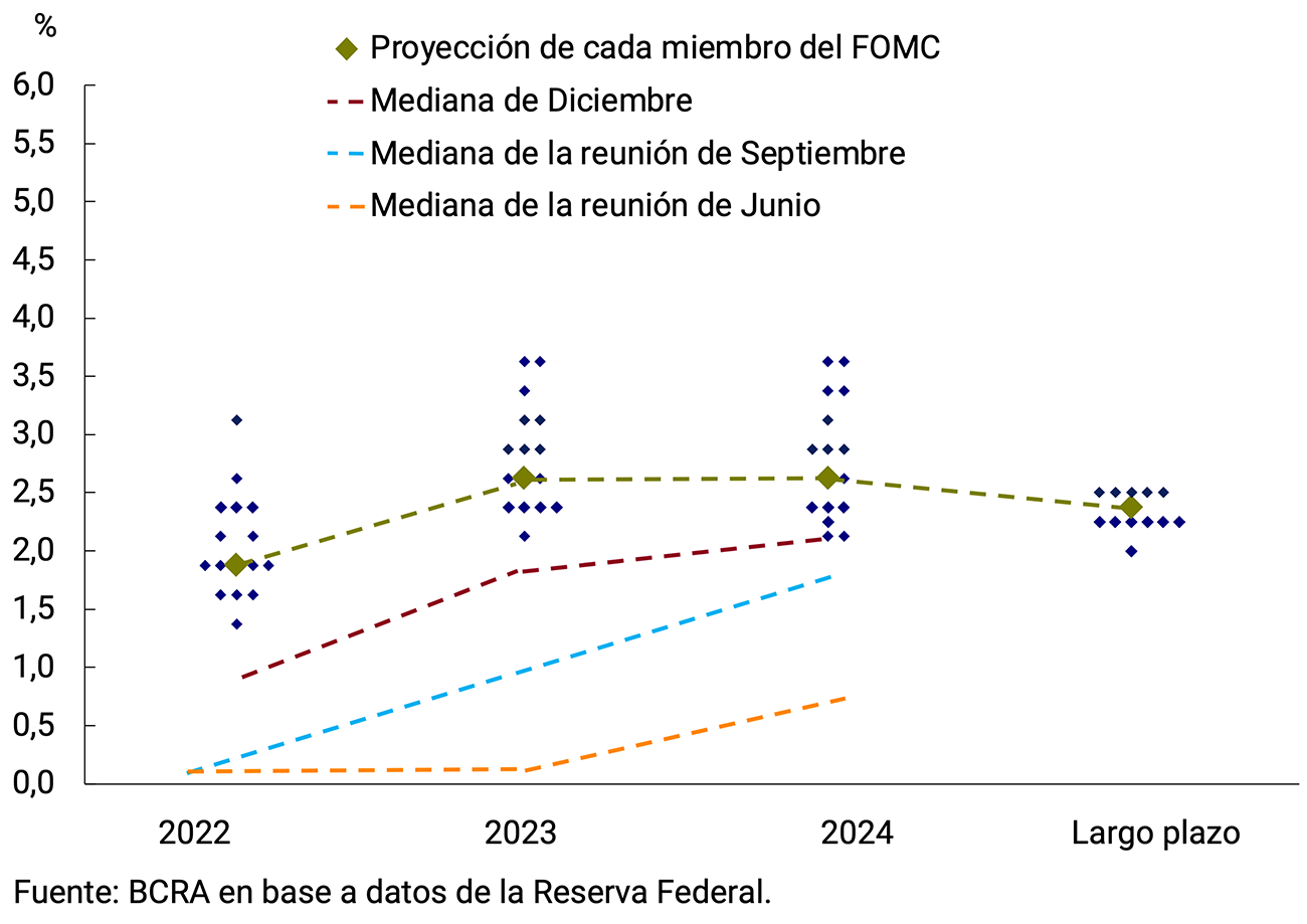 El 16 de marzo, la Fed anunció el primer incremento de su tasa interés de referencia desde 2018 (TFF, +0,25 p.p.). Además, finalizó el programa de compra de activos y en la próxima reunión de mayo anunciará cómo planea reducir sus tenencias de bonos. En muy pocos meses, la Fed aceleró marcadamente la trayectoria prevista de subas de la TFF: en su reunión de marzo de este año reveló una previsión de siete incrementos de la TFF en 2022 (el primero ya ocurrió); mientras que en diciembre de 2021 preveía tres subas de la TFF; en la reunión previa sólo dos incrementos; en la de junio 2021, ninguno; y en la de marzo de 2021 no preveía aumentos hasta 2024 (ver Gráfico 2.12).