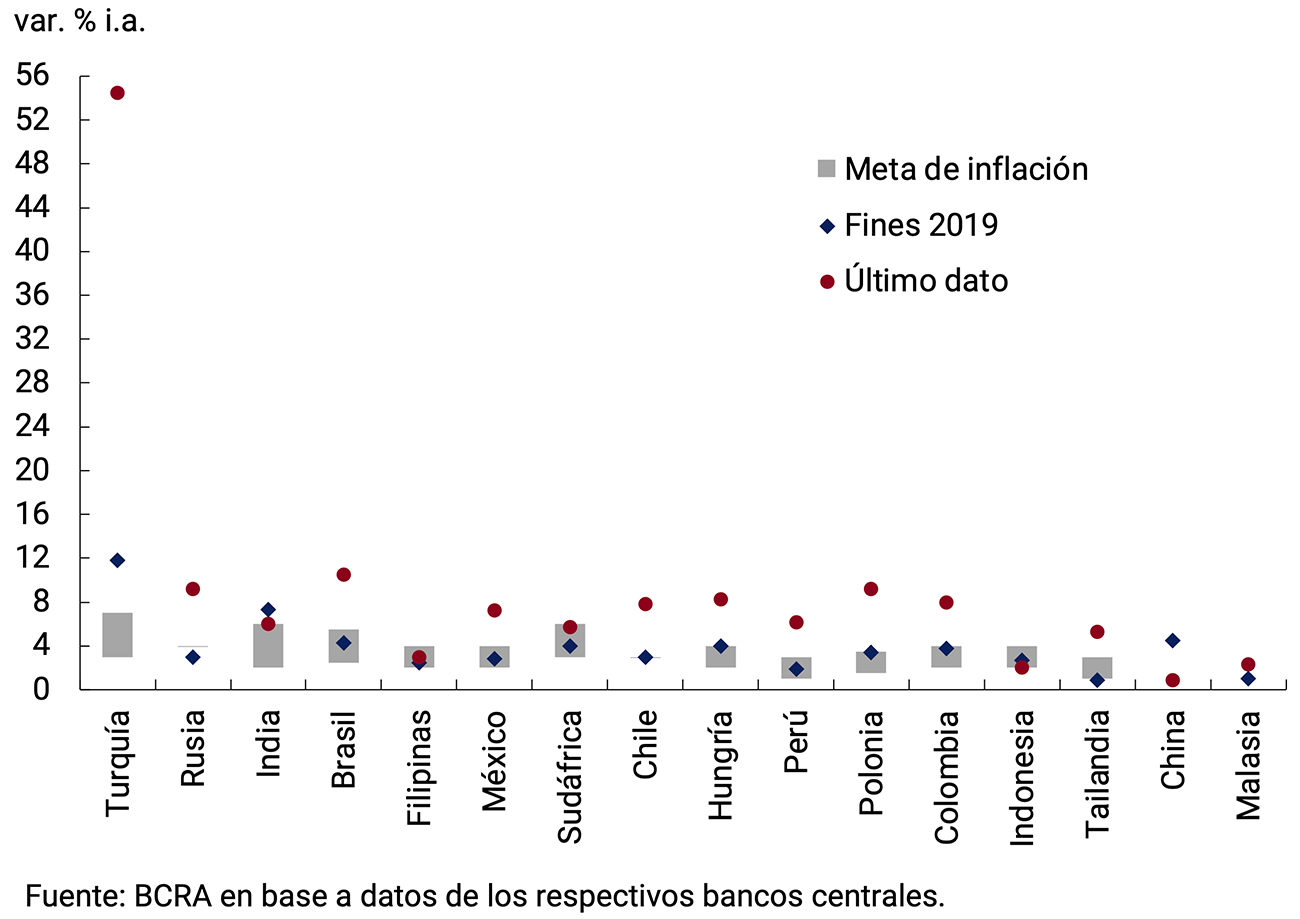 En tanto, los bancos centrales de países emergentes continuaron tomando medidas contractivas frente a presiones inflacionarias que se manifestaron antes que en los países avanzados y en mayor cuantía. La tasa de interés promedio del grupo de países relevados tocó un mínimo de 2,98% en agosto de 2020 y se ubica ahora en 6,1% (ver Gráfico 2.14). En Latinoamérica se dieron aumentos récord de tasas de interés en dos décadas: 1,5 p.p. en Brasil (en tres ocasiones) y 1,5 p.p. en Chile. Otras economías emergentes que subieron su tasa fueron Sudáfrica y Rusia (en este último caso debido también al impacto reciente de las sanciones económicas en su mercado cambiario). Por su parte, los bancos centrales de Asia, donde la inflación ha aumentado mucho menos, las mantuvieron sin cambios. La excepción fue Turquía que redujo su tasa, para luego sufrir una fuerte depreciación y el consecuente traslado a inflación (casi 11,1% mensual en enero). El alza reciente de la energía y de las materias primas agrícolas reforzaría la tendencia de la inflación durante marzo, tanto en países avanzados como en emergentes.