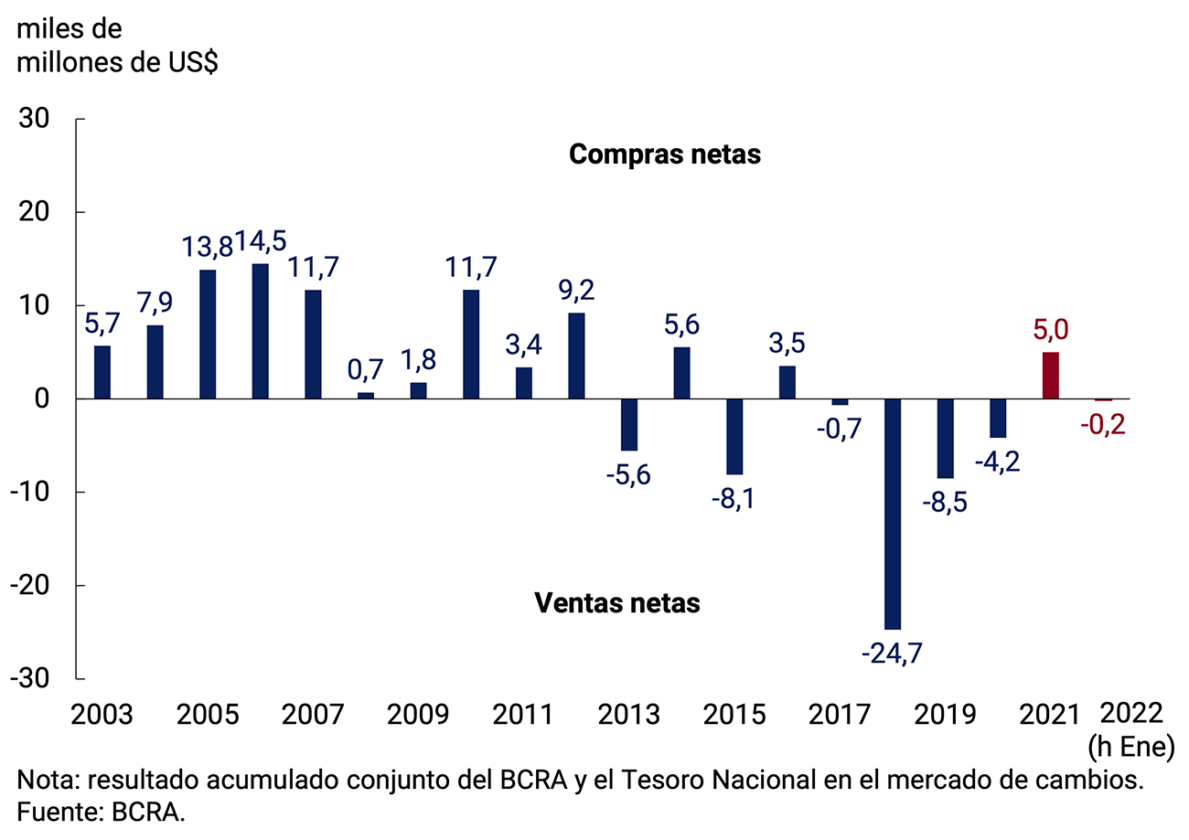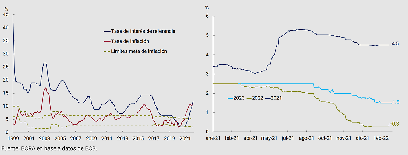 Asimismo, desde la primera semana de enero, el BCRA reconfiguró sus instrumentos de política monetaria para acompañar el proceso de recuperación económica y reforzar la estabilidad monetaria, cambiaria y financiera. Es así como se elevó la tasa de interés de referencia en dos oportunidades, llevándola desde 38,0% n.a. (45,4% e.a.) hasta 42,5% n.a. (51,9% e.a), se readecuó el límite a las tenencias de LELIQ a 28 días (focalizando la señal de tasa de interés de política en dicho instrumento), se crearon nuevos instrumentos con el fin de incrementar el plazo promedio de la esterilización y se elevaron las tasas mínimas de interés para los depósitos a plazo fijo. El incremento en la tasa de interés de política monetaria busca propender hacia retornos reales positivos sobre las inversiones en moneda local, de modo de impulsar la demanda de pesos. Es por ello que, de cara al futuro, las novedades en materia inflacionaria se verán reflejadas en la calibración de tasas de interés por parte de la autoridad monetaria.