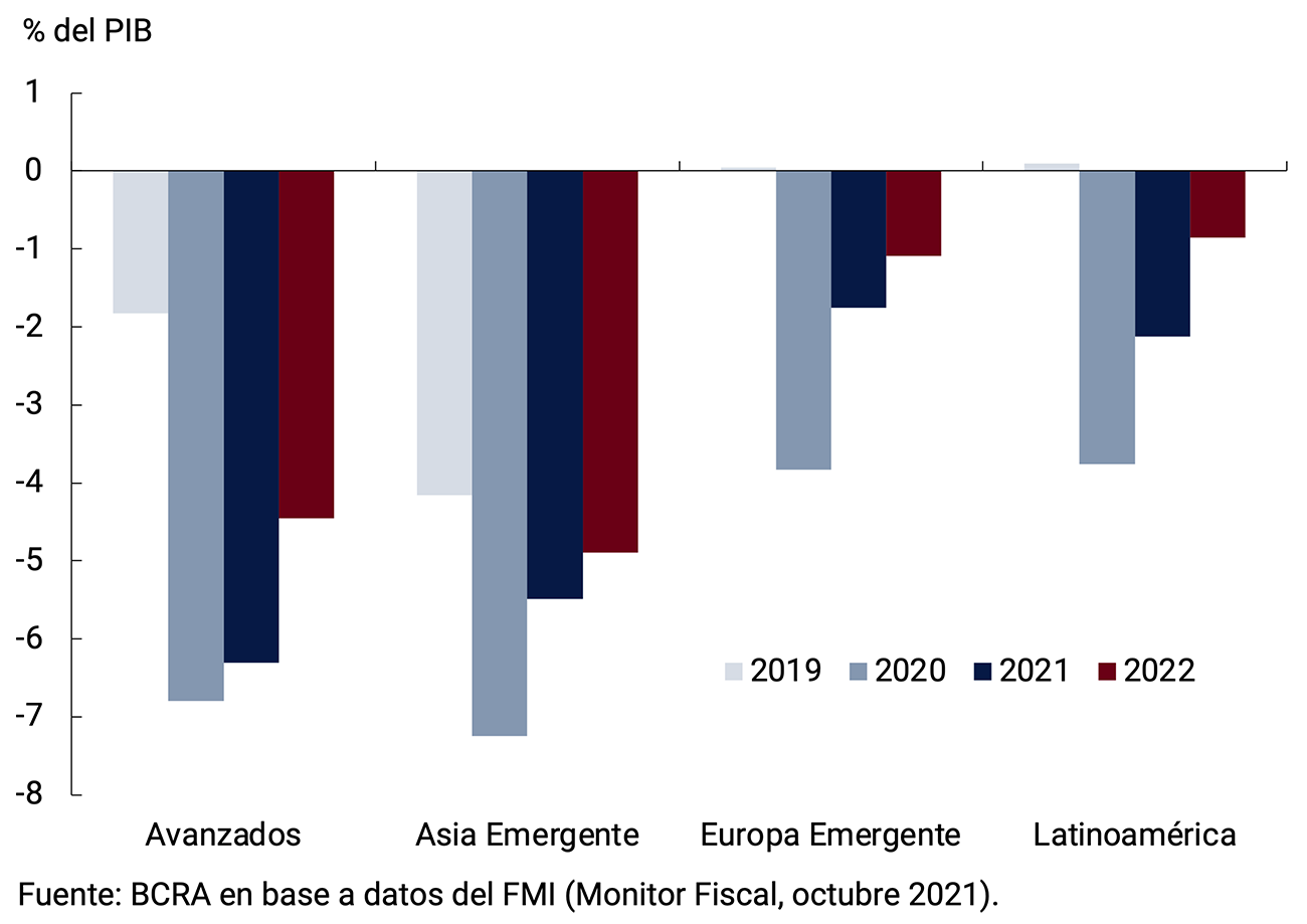 Por su parte, el impulso fiscal tendió a ser retirado durante 2021 a medida que los gobiernos redujeron el gasto destinado a paliar los efectos de la pandemia, como muestran las medidas de resultado fiscal estructural. Esta contracción fue más marcada en los países emergentes que en los avanzados, ante la menor capacidad de los primeros para financiar grandes déficits. Este año continuaría el retiro del impulso fiscal, con una reducción mayor en las economías avanzadas (ver el Gráfico 2.16).