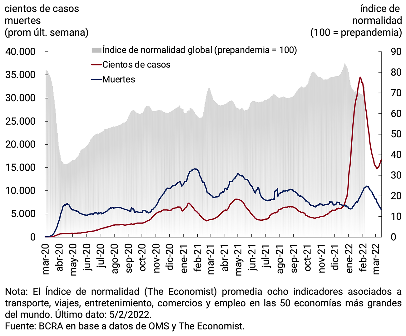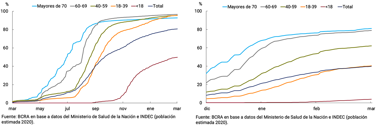 La recuperación de la actividad tuvo lugar en un contexto de una amplia cobertura de la población con esquemas completos de vacunación y el avance progresivo en la aplicación de dosis de refuerzo que, en un contexto de circulación de una nueva cepa del virus de menor letalidad, permitió acotar el impacto de la tercera ola de casos de COVID-19 a comienzos de año, con menores internaciones críticas y fallecimientos comparado con los anteriores rebrotes de la enfermedad.