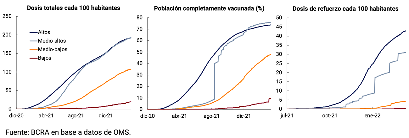 La menor letalidad se debería a las características propias de Ómicron y a la mayor inmunidad adquirida. La variante es más contagiosa y tiene mayor capacidad de reinfección (contagiar a personas previamente vacunadas o infectadas), pero suele generar una enfermedad más leve. La efectividad de las vacunas es menor en términos de anticuerpos, pero una dosis de refuerzo ayuda a aumentarlos y a mantener la protección contra la enfermedad grave. De hecho, la principal estrategia de los gobiernos ante el aumento en los casos ha sido reforzar las campañas de vacunación, aunque se mantiene la brecha entre países de mayores y menores ingresos. El porcentaje de población completamente vacunada en los países de ingresos bajos es más de 7 veces menor que en los países de ingresos altos; y mientras que los países de altos ingresos tienen más de 42 dosis de refuerzo cada 100 habitantes, los de bajos ingresos han aplicado menos de 0,3 (ver Gráfico 2.2).