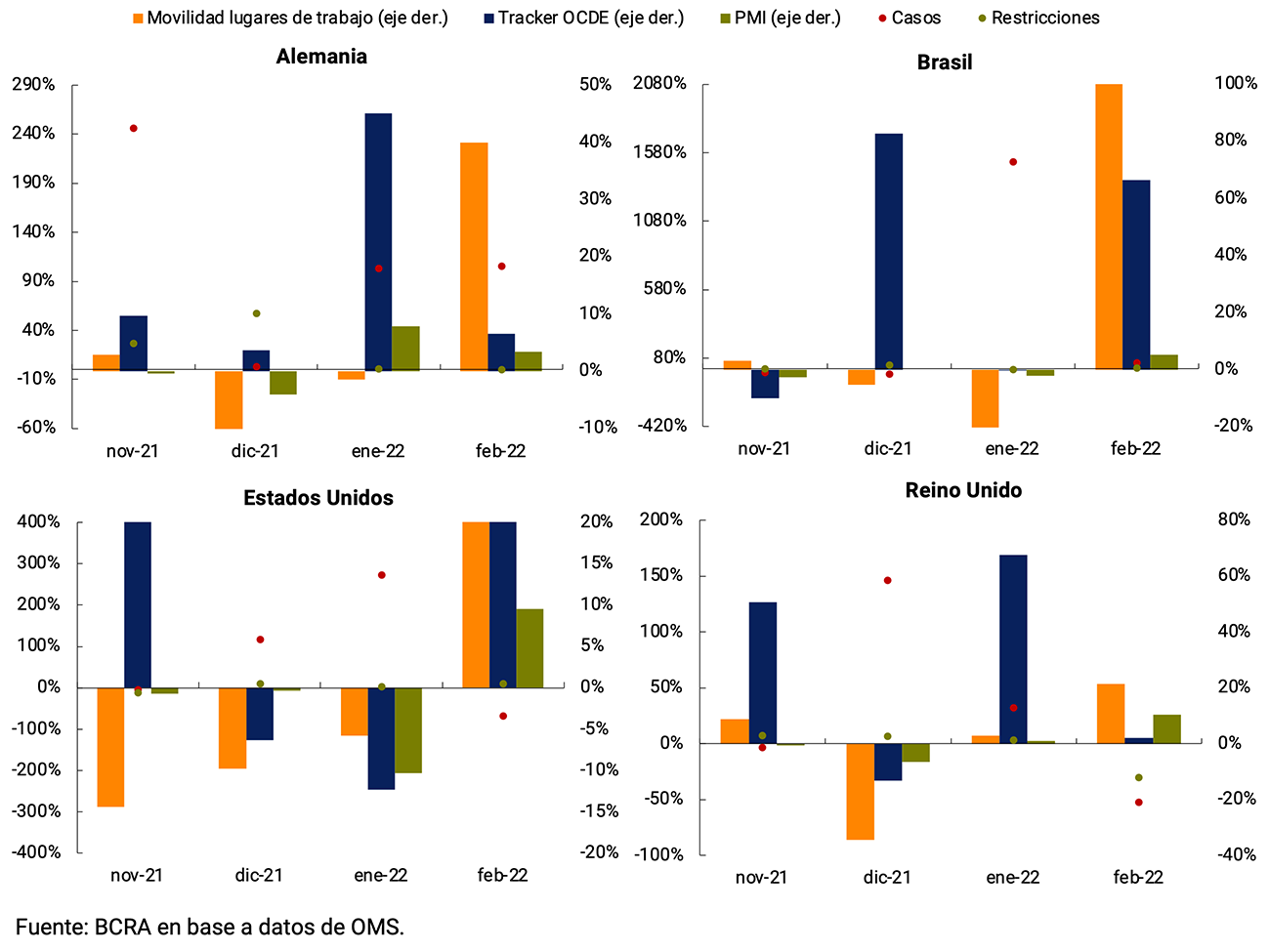 Varios países reintrodujeron restricciones, aunque con distintos niveles de rigidez, y se produjo una caída en la movilidad, con el consecuente impacto en la desaceleración de la recuperación, como se detalla en la sección siguiente. Con la baja de casos durante febrero, la movilidad volvió a aumentar y muchas restricciones comenzaron a levantarse (ver Gráfico 2.3).