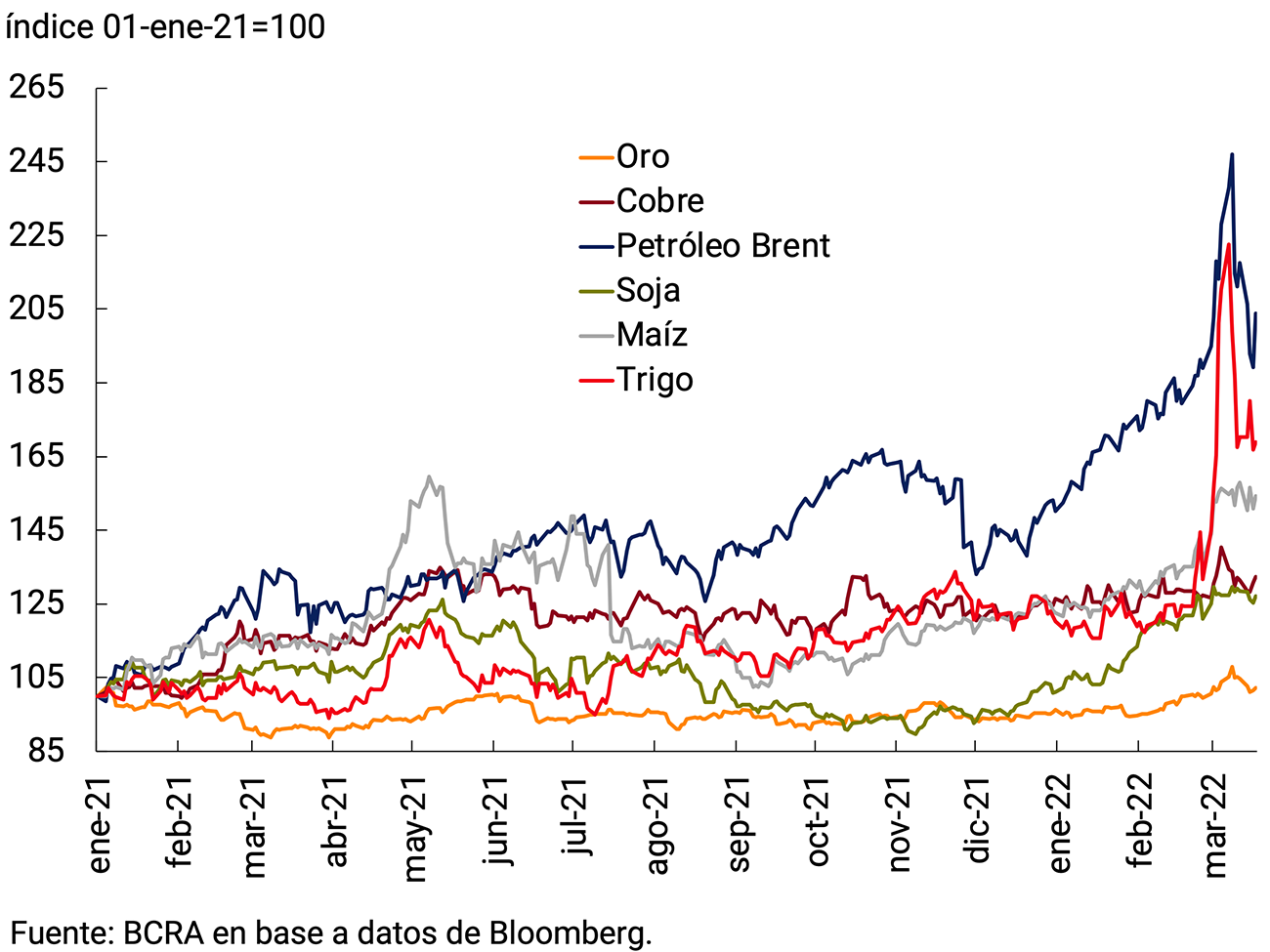El precio del petróleo venía aumentando desde diciembre por la recuperación de la demanda de combustibles y una oferta que ha tardado en responder. Las sanciones impuestas a Rusia y los problemas de transporte del petróleo impactaron fuertemente en el Brent, que alcanzó los US$139 por barril el 8 de marzo, el máximo desde 2008; y bajó hasta valores cercanos a US$100 el barril durante la semana posterior (ver Gráfico 2.4). Además, Rusia es el principal exportador mundial de gas natural, y Europa depende fuertemente de las importaciones energéticas desde aquel país. A comienzos de la crisis, el gas cotizaba a 116 euros por MWh; y llegó a alcanzar los 212 euros por MWh el 7 de marzo, representando un incremento de 83% en el mercado de referencia de Holanda.