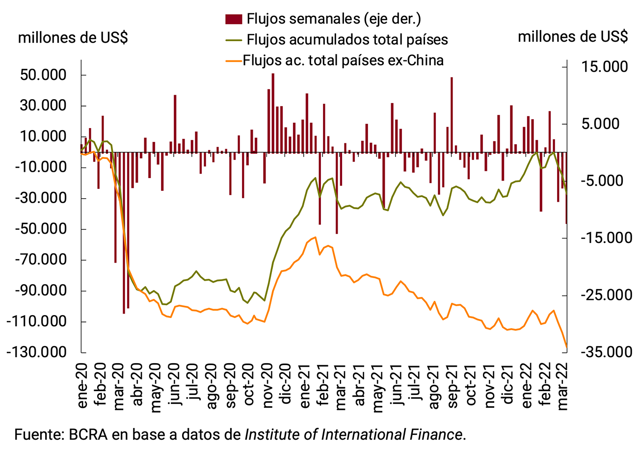 Los flujos de capitales hacia países emergentes, que venían siendo positivos y con baja volatilidad, comenzaron a mostrar salidas en las últimas semanas. Si bien los flujos acumulados desde el IPOM anterior fueron levemente positivos, desde comienzos de año fueron negativos en US$13 mil millones. Sin embargo, su composición estuvo muy concentrada. De un total acumulado de US$3,5 mil millones desde el cierre del IPOM anterior, US$17,5 mil millones fueron flujos hacia China, por lo que los flujos al resto de los emergentes resultaron negativos. Desde que comenzó la recuperación, China está absorbiendo un porcentaje creciente de los flujos a emergentes (ver Gráfico 2.7).
