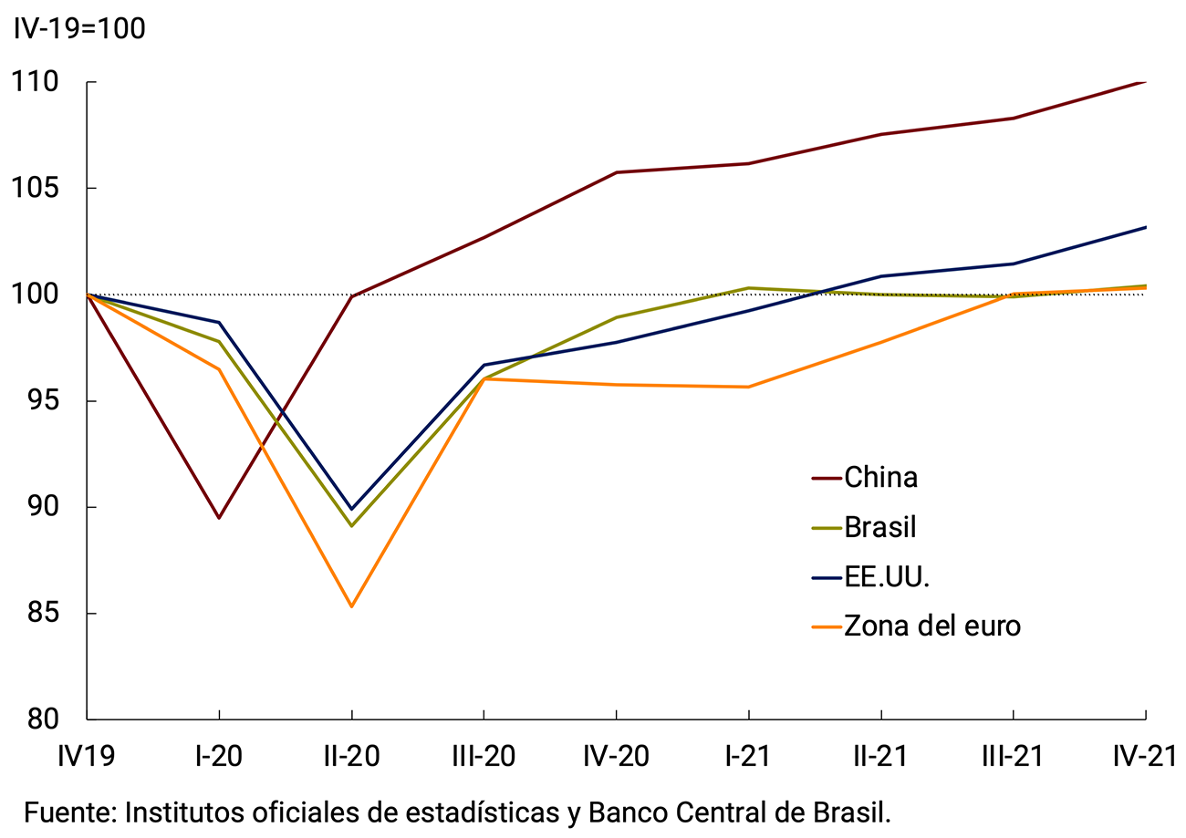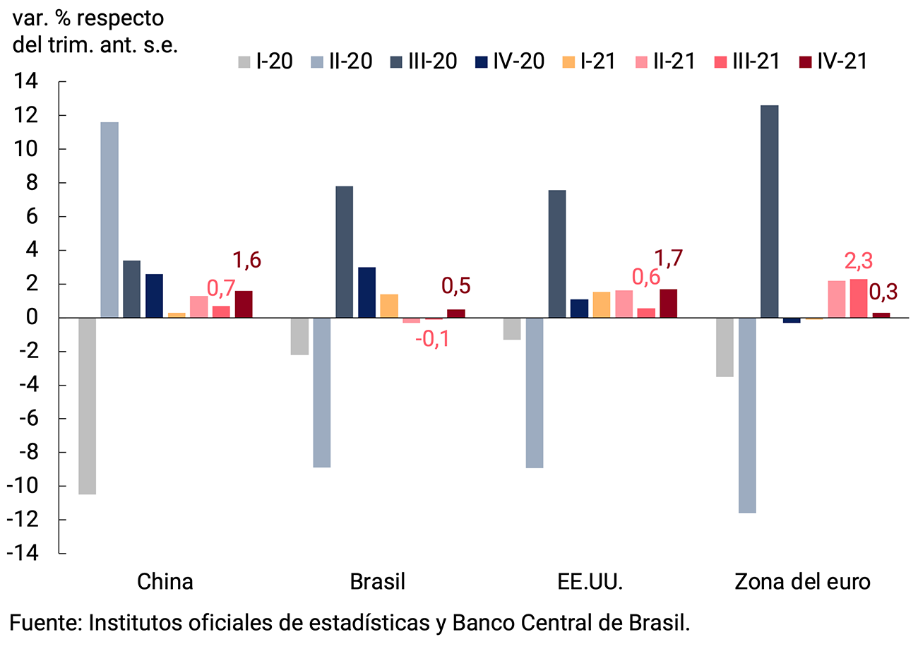 La economía global continuó creciendo en el cuarto trimestre de 2021, con dinámicas heterogéneas entre los principales socios comerciales de la Argentina (ver Gráfico 2.8). Estados Unidos, China y Brasil aceleraron su crecimiento trimestral en ese período, mientras que la Zona del euro creció menos que en los trimestres previos, ante el impacto de las restricciones a la movilidad por los rebrotes de COVID-19 y de los cuellos de botella. Así, sobre el final del año pasado, los niveles de actividad de Estados Unidos y China se ubicaron claramente por encima de los previos a la pandemia, mientras que la Zona del euro y Brasil evidenciaron mayores dificultades para superarlos (ver Gráfico 2.8).
