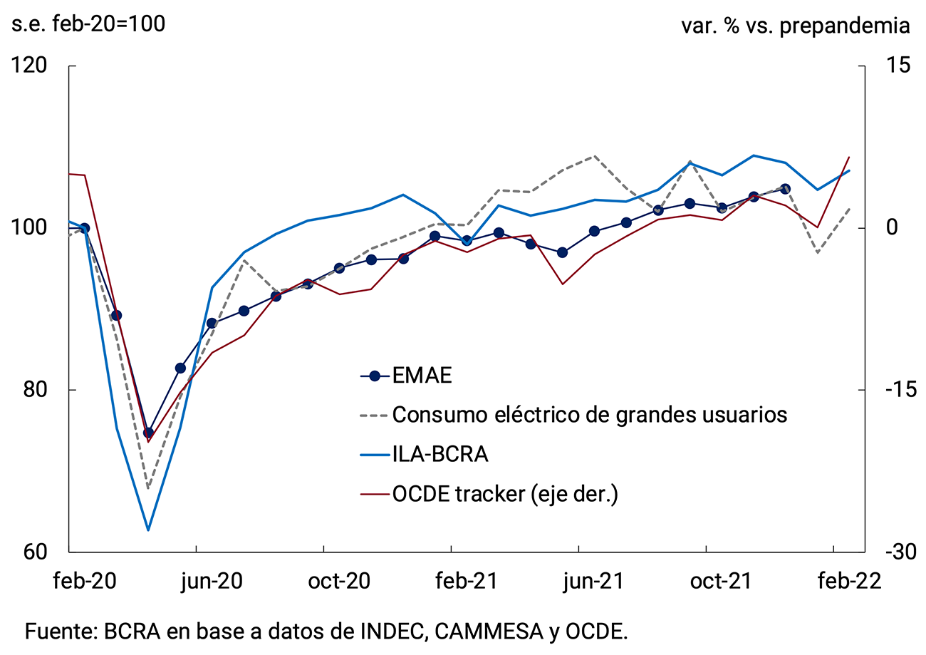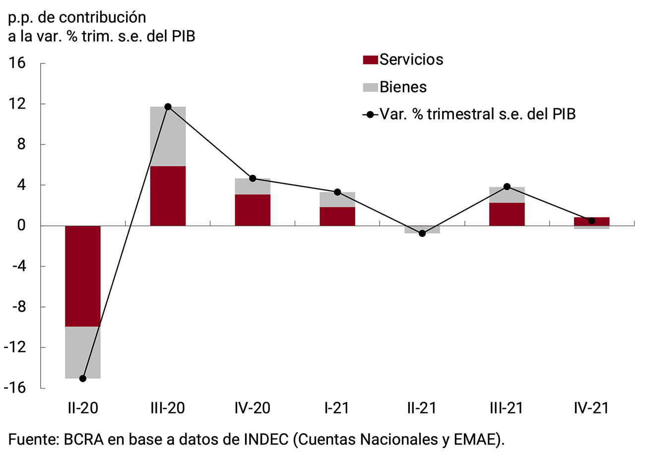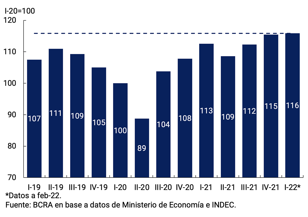 Tras recuperarse 10,3% durante 2021 y con un muy buen desempeño en el último trimestre, el PIB cuenta con un arrastre estadístico de 4,1 puntos porcentuales de crecimiento para este año. Con un mayor grado de inmunidad de la población, el rápido avance de la aplicación de dosis de refuerzo de las vacunas contra el COVID-19, el BCRA espera que los servicios que aun vienen rezagados logren recomponer los niveles de actividad prepandemia, en un entorno de gran adaptación de hogares y firmas a los cuidados preventivos y un mayor flujo de turismo internacional. En el mismo sentido, contribuirán las políticas de estímulo implementadas por el Gobierno Nacional y el BCRA. No obstante, la evolución de la actividad en el corto plazo está condicionada por los riesgos asociados a un escenario internacional menos favorable, con el deterioro del contexto financiero y las tensiones en el mercado energético, a las condiciones climáticas y a la circulación de nuevas variantes del virus a nivel global.