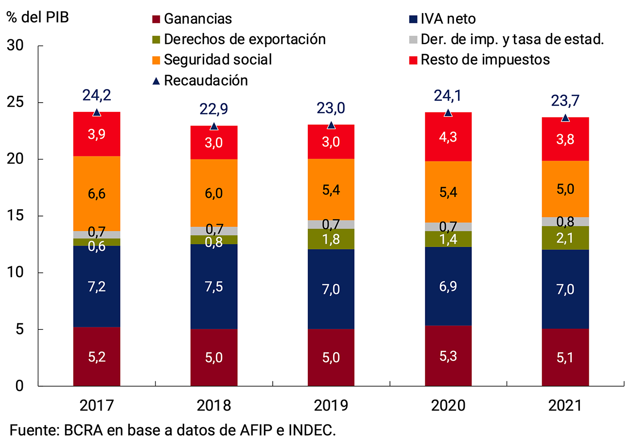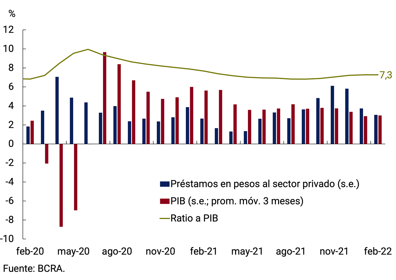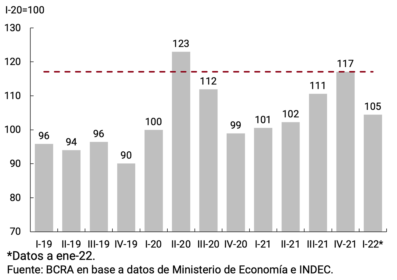Tras recuperarse 10,3% durante 2021 y con un muy buen desempeño en el último trimestre, el PIB cuenta con un arrastre estadístico de 4,1 puntos porcentuales de crecimiento para este año. Con un mayor grado de inmunidad de la población, el rápido avance de la aplicación de dosis de refuerzo de las vacunas contra el COVID-19, el BCRA espera que los servicios que aun vienen rezagados logren recomponer los niveles de actividad prepandemia, en un entorno de gran adaptación de hogares y firmas a los cuidados preventivos y un mayor flujo de turismo internacional. En el mismo sentido, contribuirán las políticas de estímulo implementadas por el Gobierno Nacional y el BCRA. No obstante, la evolución de la actividad en el corto plazo está condicionada por los riesgos asociados a un escenario internacional menos favorable, con el deterioro del contexto financiero y las tensiones en el mercado energético, a las condiciones climáticas y a la circulación de nuevas variantes del virus a nivel global.