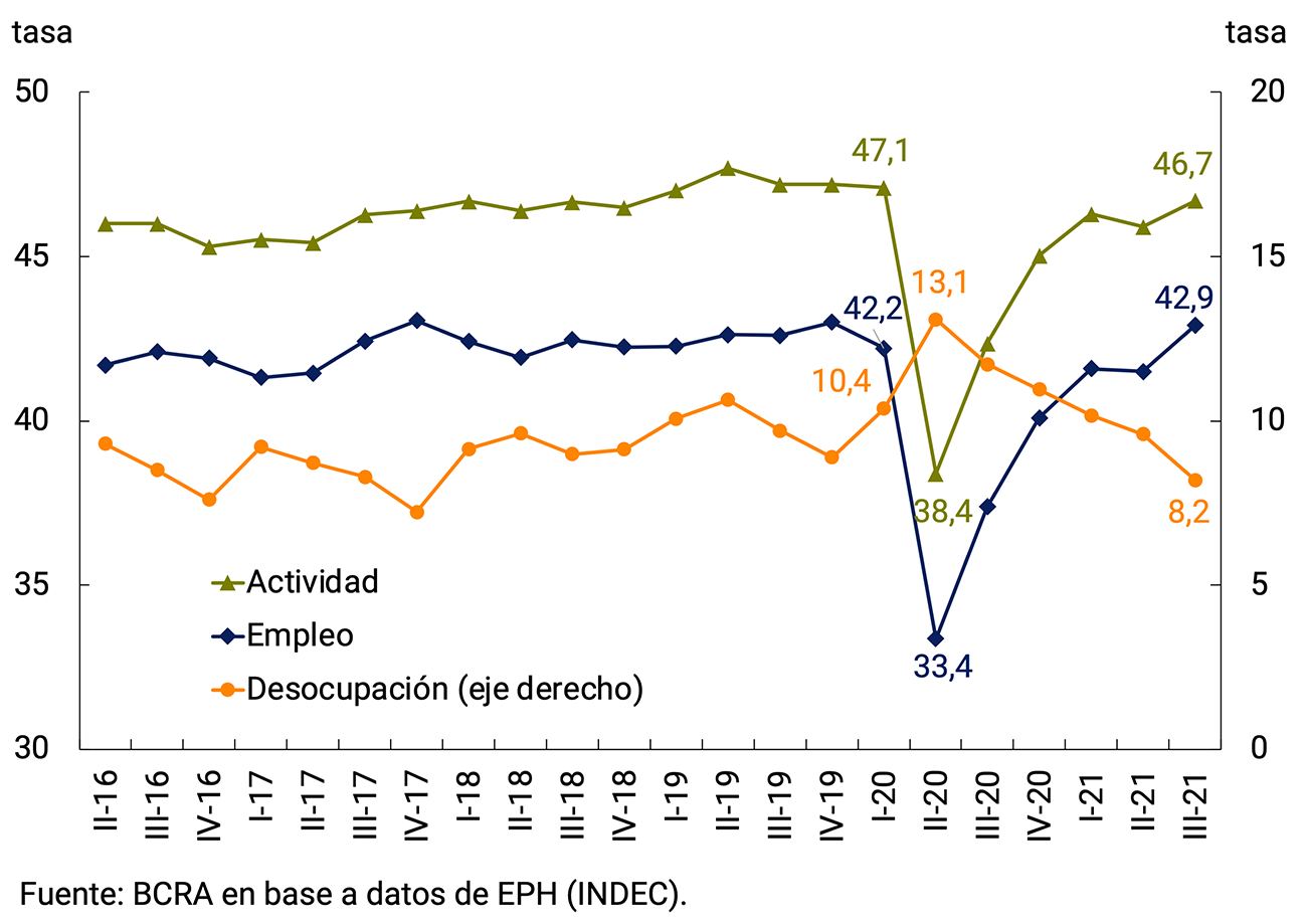 De acuerdo con los datos de la Encuesta Permanente de Hogares (EPH), en el tercer trimestre de 2021 el empleo retomó su crecimiento, registrando un aumento interanual de 5,5 p.p. en consonancia con la mejora de la actividad económica. La PEA12 también mostró un alza respecto al trimestre anterior y se ubicó en 46,7% (+4,4 p.p. i.a.). Este efecto estuvo probablemente asociado a la normalización de las actividades económicas ante la merma de restricciones relacionadas con la segunda ola de la pandemia. De esta manera, fue la creación del empleo la que traccionó este aumento de la PEA generando una baja en la tasa de desempleo que se ubicó en 8,2% (-3,5 p.p. i.a.; ver Gráfico 3.10).