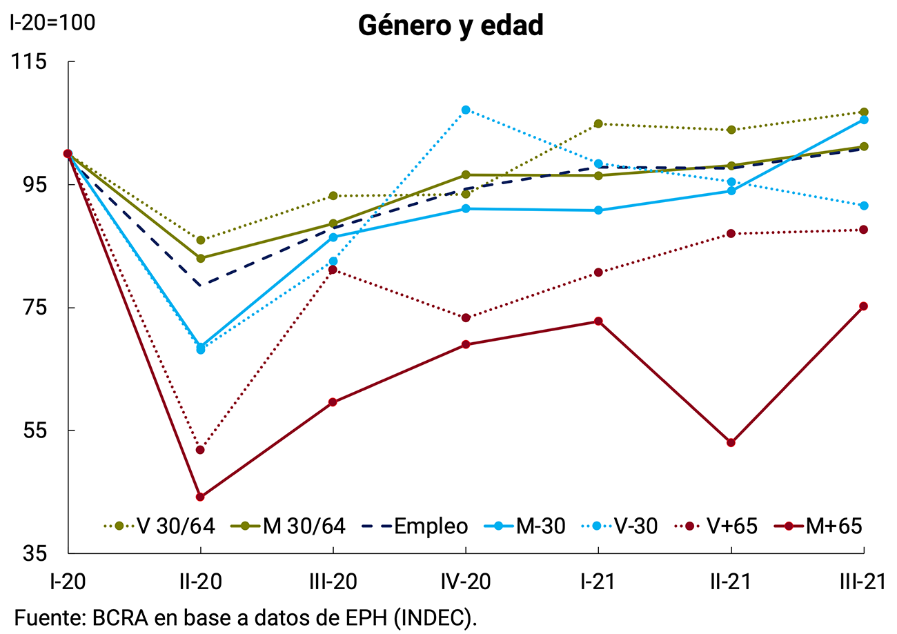 Realizando un corte por rango etario y género cabe destacar la dinámica del empleo dentro de las mujeres menores de 30 años (ver Gráfico 3.11 y Apartado 2 / Asincronías en el Mercado Laboral) y de las mujeres mayores de 65 años. Ambos grupos, que por distintos motivos tuvieron una moderada recuperación luego del impacto inicial de la pandemia, mostraron un fuerte aumento en el tercer trimestre de 2021.