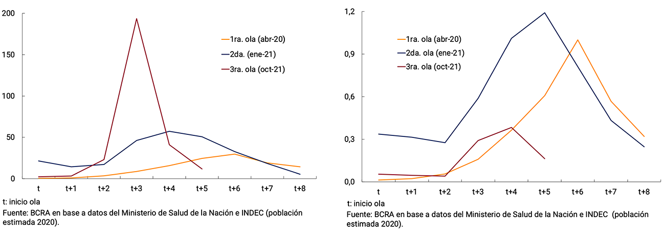 El aumento exponencial de los contagios por COVID-19 a fines de 2021 y comienzos de este año —cuando la cantidad de casos más que duplicó el pico de mayo pasado con fuerte prevalencia de la cepa denominada Ómicron— reavivó la incertidumbre respecto del impacto económico que podría causar esta tercera ola de la pandemia. Las estadísticas del Ministerio de Salud demuestran que la vacunación ha resultado muy efectiva para mitigar la gravedad de la enfermedad ante el desarrollo de nuevas variantes del coronavirus y, en línea con la experiencia internacional, el número de contagios evidenció un rápido descenso (ver Capítulo 2. Contexto Internacional). La amplia cobertura de vacunación con esquemas completos de la población total y la de mayor riesgo con una dosis de refuerzo5, redundó en una menor tasa de hospitalización y de muertes en comparación a los picos de contagios anteriores (de abril de 2020 e inicios de 2021; ver Gráfico 3.2). De acuerdo con lo informado por las autoridades sanitarias locales, las personas desprotegidas (no vacunados), los que contaban con una sola dosis y personas de mayor riesgo por presentar comorbilidades, han representado una importante proporción de las internaciones más recientes por COVID-19.