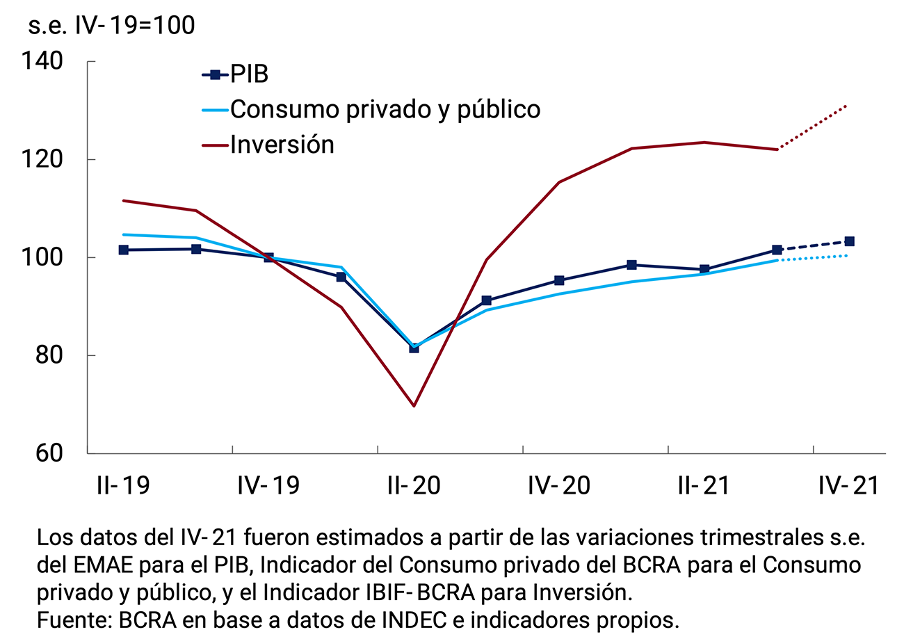 En el tercer trimestre de 2021, el PIB se incrementó 4,1% trimestral s.e. (11,9% i.a.) y se ubicó 1,6% s.e. por encima de su nivel del último trimestre de 2019. La demanda interna —el gasto interno total en concepto de consumo e inversión— superó en 3,1% s.e. su nivel prepandemia y se recuperó 2,1% trimestral s.e. básicamente por el desempeño del consumo: el consumo privado se recuperó 2,8% trimestral s.e. (12,1% i.a.) y el consumo público aumentó 3,4% s.e. (11,5% i.a.). La inversión6 fue el único componente de la demanda agregada que se retrajo en relación con el trimestre anterior (-1,2% s.e.; 21,2% i.a.). La demanda externa de bienes y servicios aumentó 7,3% trimestral s.e. (18,8% i.a.) y las importaciones, 1,7% trimestral s.e. (26,2% i.a.)7. Los datos del EMAE del cuarto trimestre anticipan una nueva suba del PIB, con aumentos tanto en el consumo como en la inversión.
