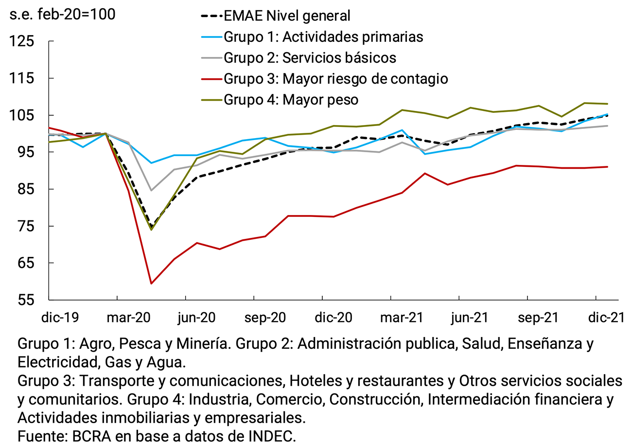 La actividad económica continuó mejorando en el cuarto trimestre de 2021 y se mantuvo operando en niveles superiores a los prepandemia, cerrando el año con un dinamismo superior al esperado inicialmente. Los datos disponibles del EMAE de diciembre evidenciaron una progresiva reducción de la heterogeneidad sectorial —con una recuperación que al principio había sido liderada por la industria, el comercio y la construcción—. Los sectores de mayor riesgo sanitario comenzaron a operar en niveles más cercanos a los de prepandemia tras la progresiva normalización de la movilidad social.