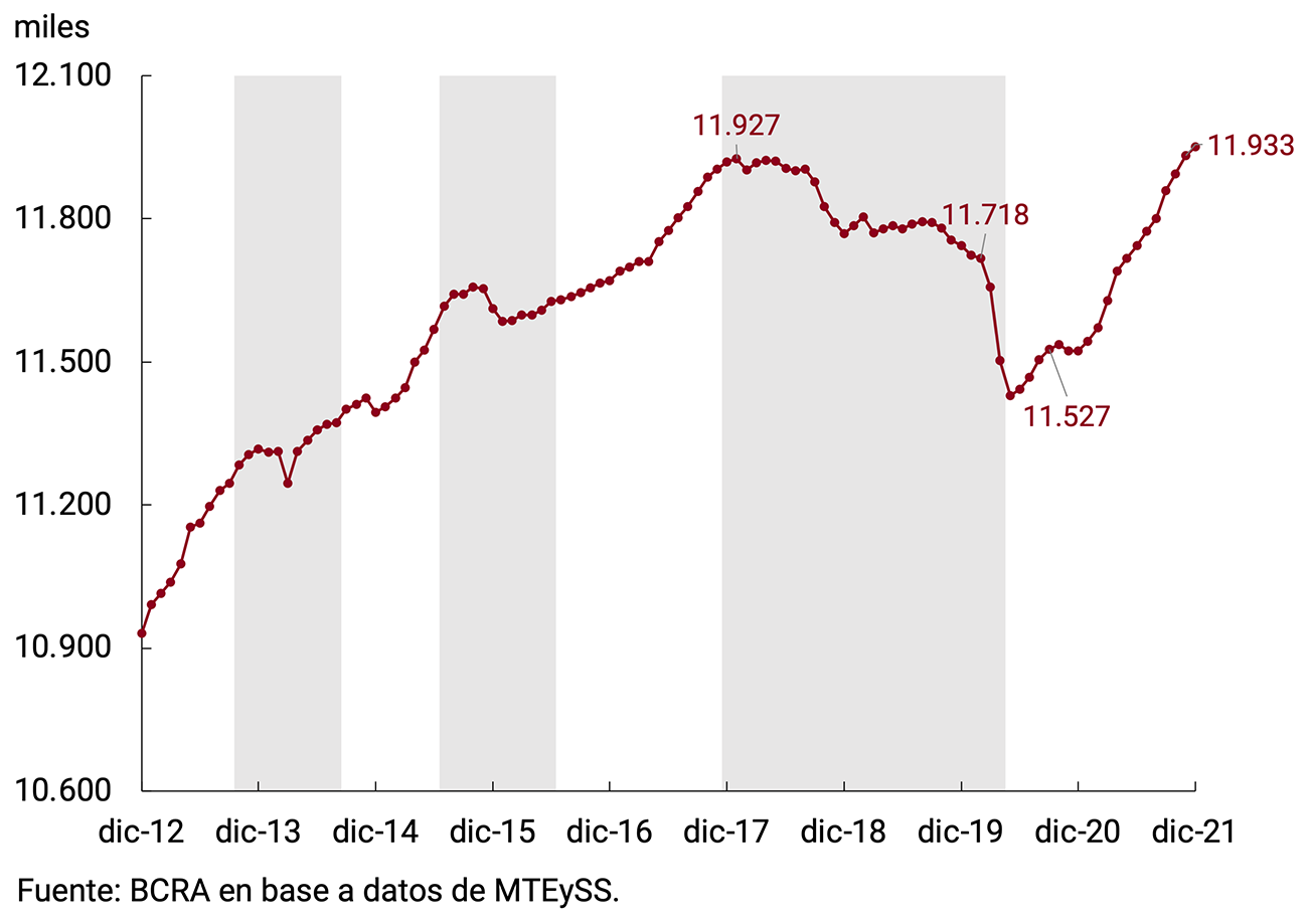 Con datos a diciembre de 2021, según el Ministerio de Trabajo, Empleo y Seguridad Social (MTEySS), el empleo registrado alcanzó niveles máximos históricos de ocupación en términos desestacionalizados superando el máximo anterior de enero de 2018 (ver Gráfico 3.7). El ritmo de expansión durante el cuarto trimestre mantuvo la dinámica evidenciada desde principios de 2021, creciendo al 0,3% mensual en promedio.