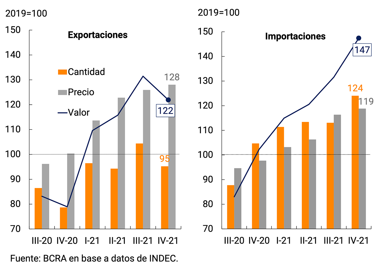 Con respecto al sector externo y en línea con la información referida al Intercambio Comercial de Bienes del INDEC, en el cuarto trimestre el aporte de las Exportaciones netas de bienes y servicios a la variación trimestral del Producto habría sido negativa. Las cantidades exportadas de bienes registraron una caída trimestral (-9% s.e.), mientras que los volúmenes importados de bienes se incrementaron 9,7% en términos desestacionalizados (ver Capítulo 4. Sector Externo).