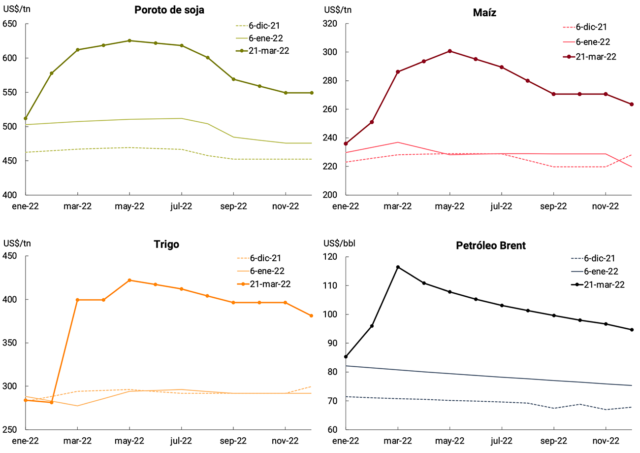 El conflicto armado implica menores proyecciones de crecimiento global. Su impacto inicial ha reforzado las tendencias previas de endurecimiento de las condiciones financieras globales y suba de los precios de las materias primas. Según el Banco Central Europeo, la expansión de la economía mundial caería de 4,5% a 4,1% en 2022 y de 3,9% a 3,6% en 2023 y, en la Zona del euro, de 4,3% a 3,7% en 2022 y de 2,9% a 2,8% en 2023. Por su parte, el directorio de la Fed también redujo sus pronósticos de crecimiento para este año, de 4,0% a 2,8%, pero mantuvo el del próximo año en 2,2% (ver Cuadro 2.1).