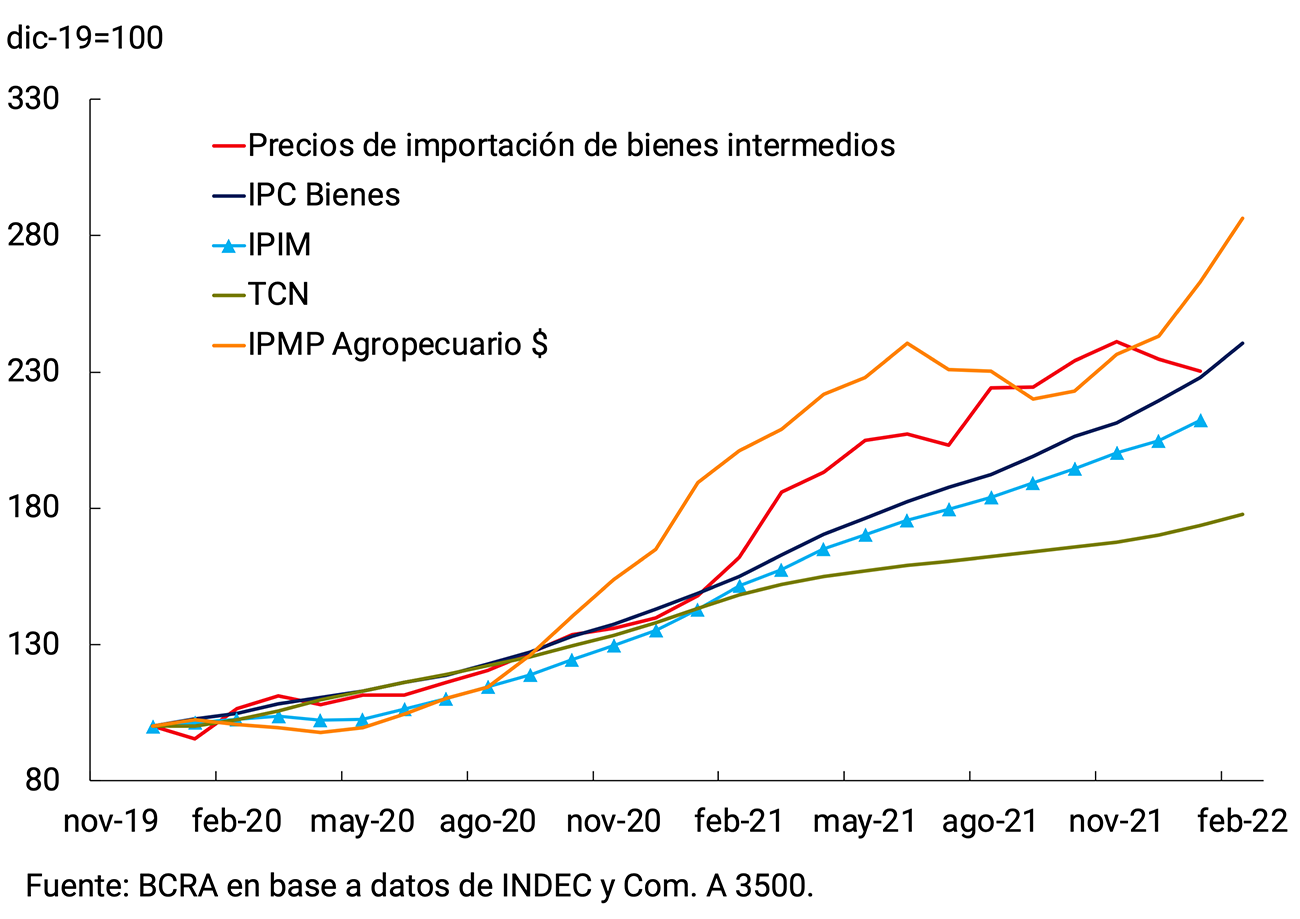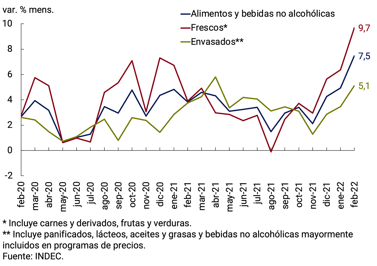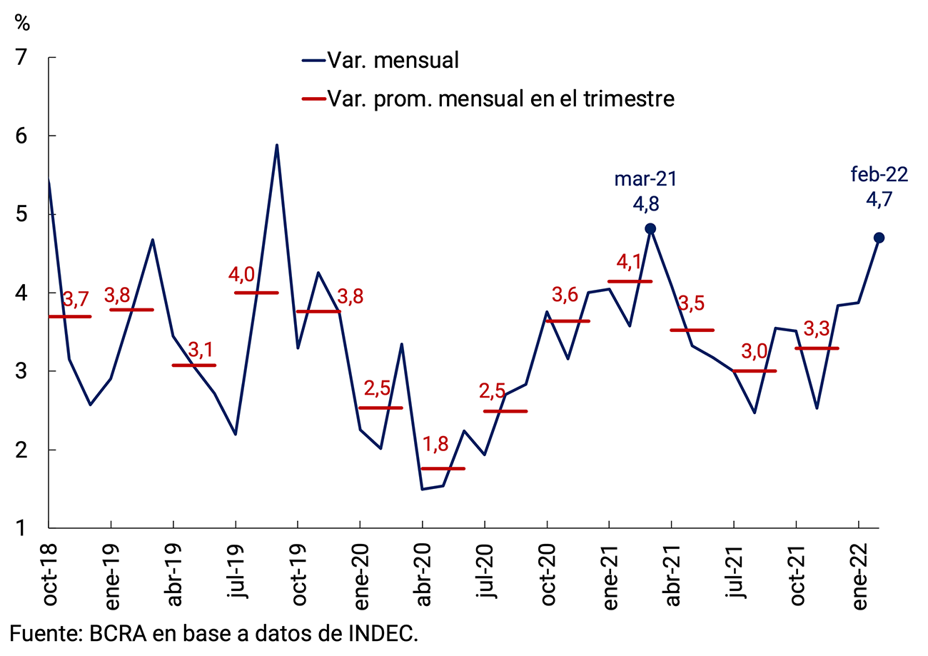En este entorno macroeconómico más dinámico, durante el primer bimestre del año la inflación volvió a acelerarse y promedió 4,3% por mes, por encima del 3,3% promedio mensual observado durante el cuarto trimestre de 2021. El mayor dinamismo de los precios desde septiembre de 2021 se verificó en un contexto de recomposición de los márgenes de comercialización de ciertos sectores, reapertura de las paritarias salariales y de expectativas de inflación más elevadas como resultado de las mayores presiones cambiarias típicamente asociada a los procesos electorales, en donde el sector privado suele acentuar su patrón de dolarización financiera, a lo que se sumó la incertidumbre financiera generada por entrar en una etapa de definición de la negociación con el FMI por un nuevo acuerdo sobre la deuda con el organismo. Al escenario de elevada inercia inflacionaria, se sumaron desde enero las desfavorables condiciones climáticas domésticas y el significativo aumento de los precios internacionales de las materias primas agrícolas, la energía y las manufacturas globales, que presentaron una aceleración ante el conflicto entre Rusia y Ucrania, lo cual plantea un escenario desafiante, especialmente para el próximo bimestre.