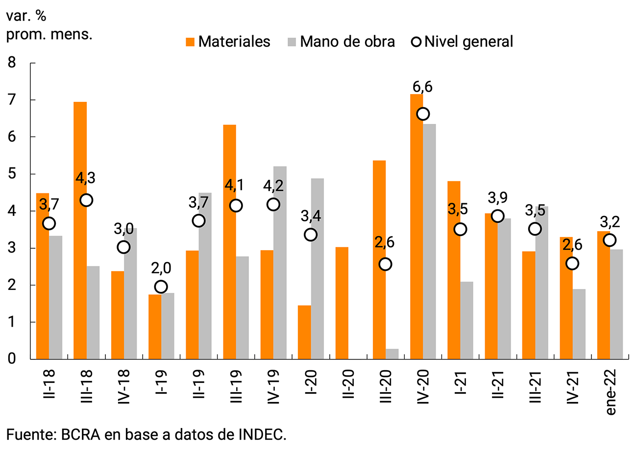 Por su parte, el indicador IBIF-BCRA9 se recuperó significativamente y presentó una mejora trimestral de 7,7% s.e. en el cuarto trimestre de 2021. Dicha suba respondió a un incremento de la inversión en equipamiento durable tanto de origen importado como nacional y, en menor medida, de la construcción.