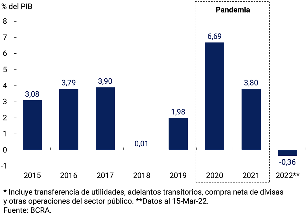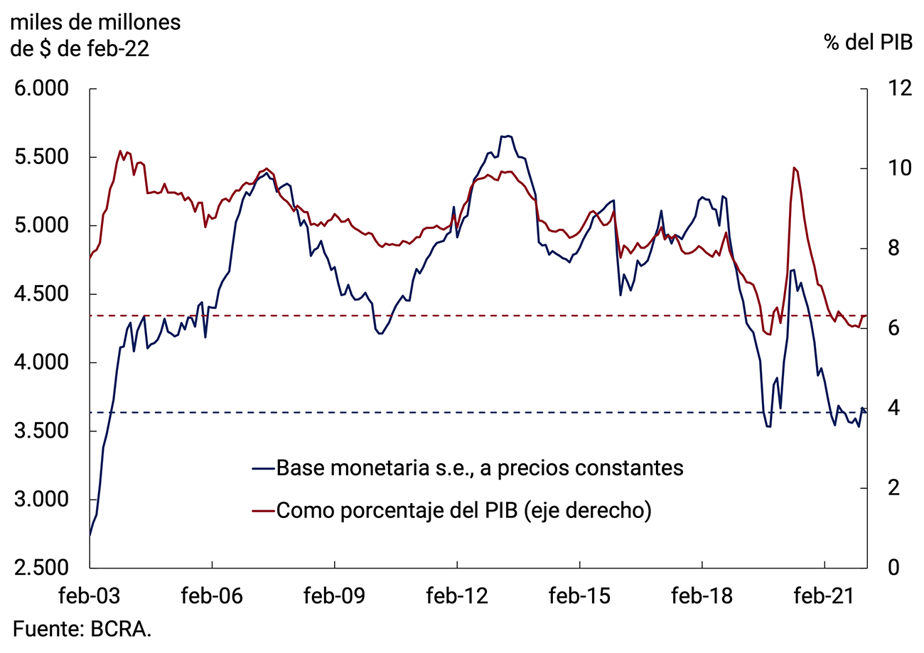 A su vez, el BCRA continuará calibrando la liquidez de la economía, esterilizando eventuales excedentes, para contribuir a preservar el equilibrio monetario. Al respecto, en 2021 la expansión primaria vinculada al sector público se ubicó en niveles sensiblemente menores a los del año 2020, reflejando valores respecto del PIB similares a los de años previos, y en lo que va del año ayudó a contraer liquidez en el mercado. La compra de divisas al sector privado también contribuyó positivamente a la expansión de la Base Monetaria durante 2021 y en los primeros meses del año en curso. Estos factores fueron parcialmente esterilizados a través de instrumentos de regulación monetaria (pases pasivos y LELIQ). Con todo, la Base Monetaria finalizó el año con una expansión del 40,0%, lo que implicó una contracción en términos reales, y el saldo de pasivos remunerados se ubicó en torno a 9,7% del PIB. Dado el crecimiento proyectado de la demanda de base monetaria, se estima que, por cada 1 p.p. de aumento de tasas de interés de política monetaria, los pasivos remunerados aumentarían en 0,07 p.p. del PIB. Aun contemplando este efecto, en un contexto de menores necesidades de esterilización, durante 2022 los pasivos remunerados se reducirán en relación con el PIB.