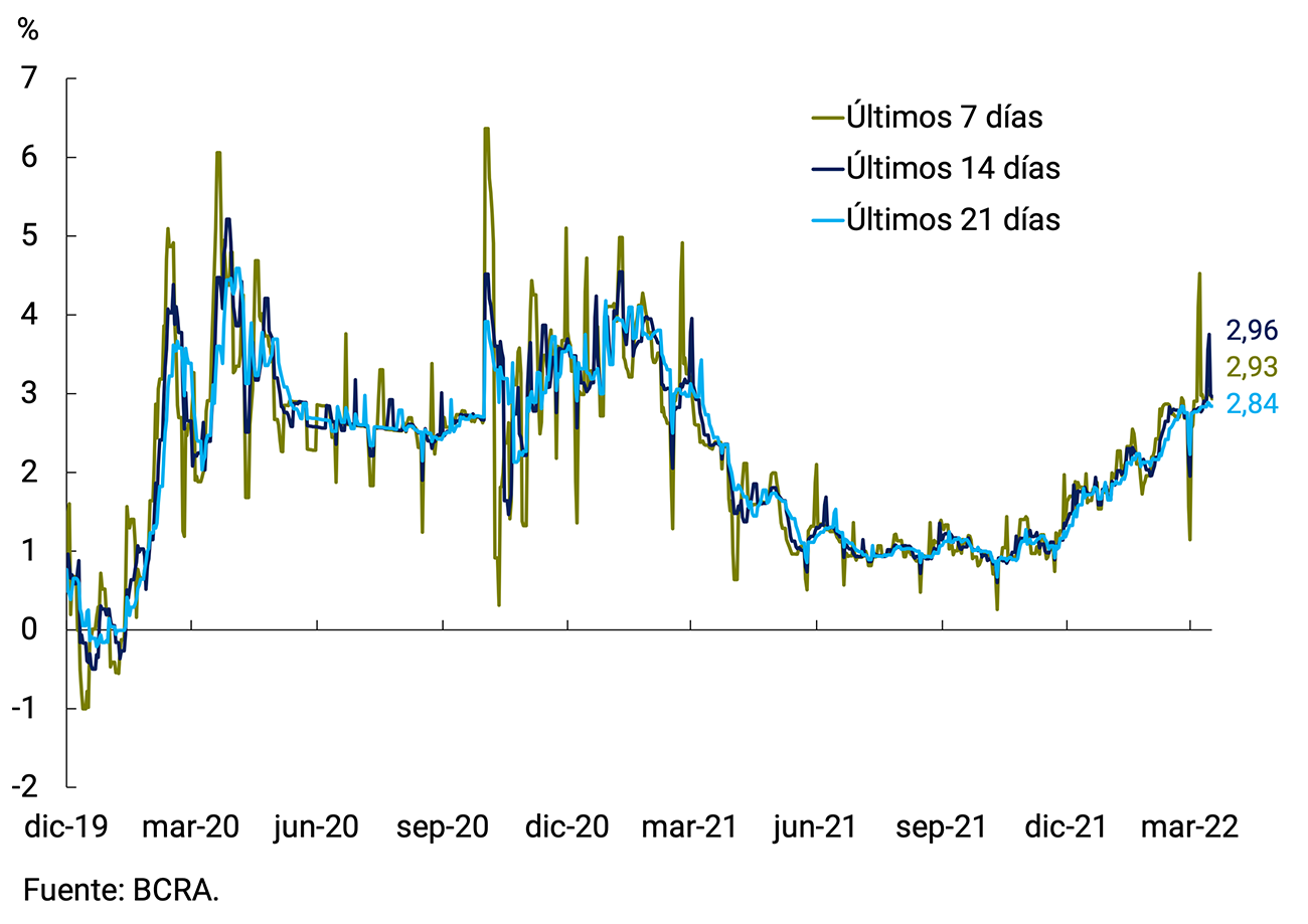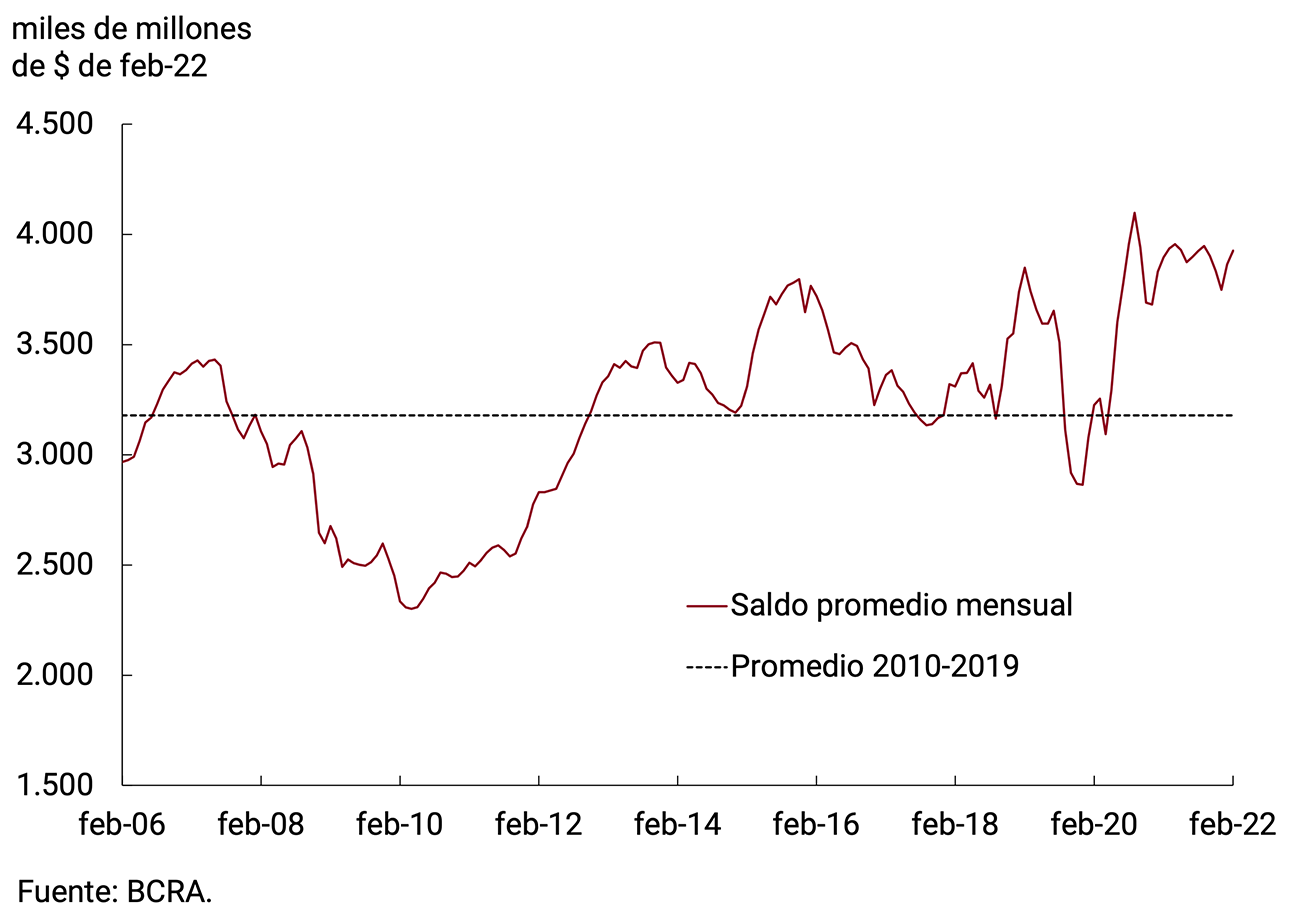 Los cambios en la estructura de instrumentos de esterilización fueron acompañados por una suba en la tasa de interés de referencia de los instrumentos de esterilización. Con todo, la tasa promedio ponderada de los pasivos remunerados del BCRA se ubicó en 41,3% n.a. (50,0% e.a.). La suba está en línea con los Objetivos y Planes presentados para el año en curso y busca propender a un nivel que permita resguardar el valor real del ahorro de las y los argentinos. Para lograr que el incremento en la tasa de política monetaria se traslade a las tasas que enfrentan los ahorristas, el BCRA incrementó, también en dos oportunidades, las tasas pagadas por las colocaciones a plazo fijo. Las mayores tasas de interés contribuirán a apuntalar la demanda de instrumentos de ahorro en pesos, lo que contribuirá a preservar la estabilidad monetaria y cambiaria.